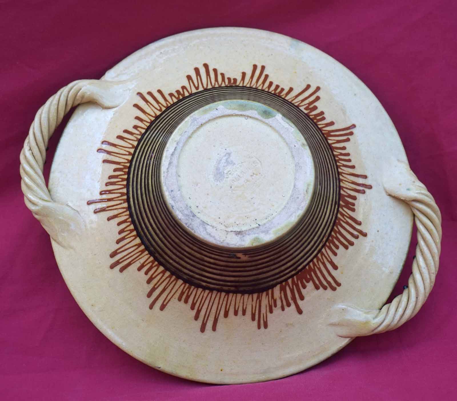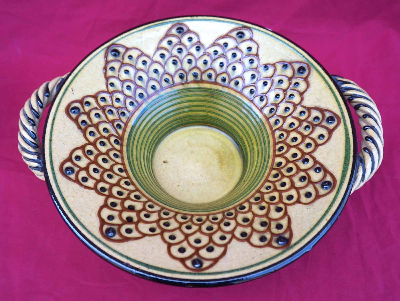 French hand painted ceramic basket shaped dish made by AEGITNA in VAllauris during the 1930's. It's stamped on the back. 10 3/4" (27.4cm) width with the handles, 6 5/8" (7cm) height. Beautiful condition a tiny glaze shortage on the edge