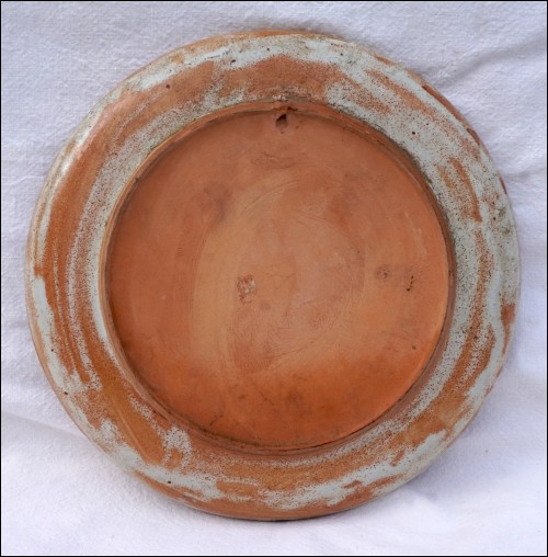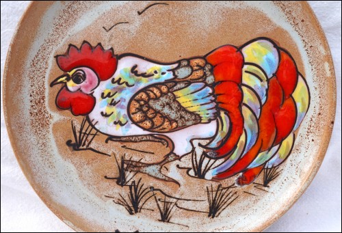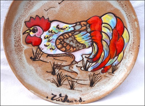 Vintage french enameled ceramic rooster plate made in Vallauris during the 1960's. It's signed Vallauris in front. 9 1/2" (24.6cm) diameter. Perfect condition with hole for hanging on the back as shown by the following pictures.