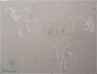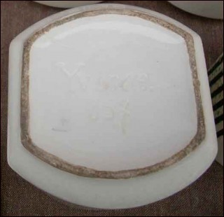 Vintage canister set of 12 pcs model Yvonne in faience made in Czechoslovakia during the 1940's. The set is made of 6 tall canisters for Rice Coffee Flour Sugar Noodles Chicory , 4 small canisters for Tea Spices Nutmeg Stock an 2 cruet for Oil and Vinegar. Good condition only one lid has 2 chips the oil bottle has stains on the back as you can see on the pictures below. All are stamped on the back Yvone. Dimensions for the tall 8" high 4 3/4" width, for the small 4 1/8" high 2 3/8" with and for the bottle 8 1/2" high 3 3/8" width.