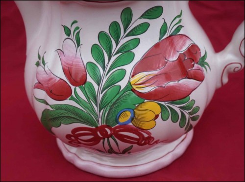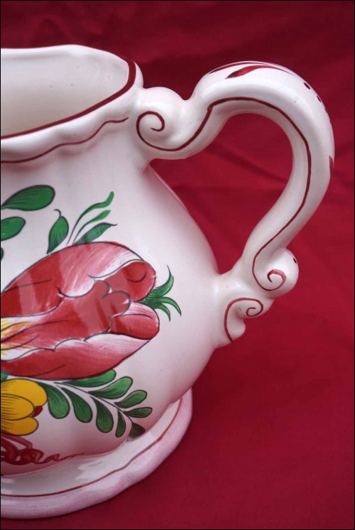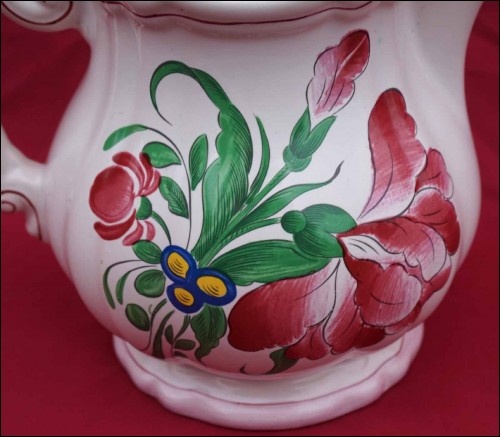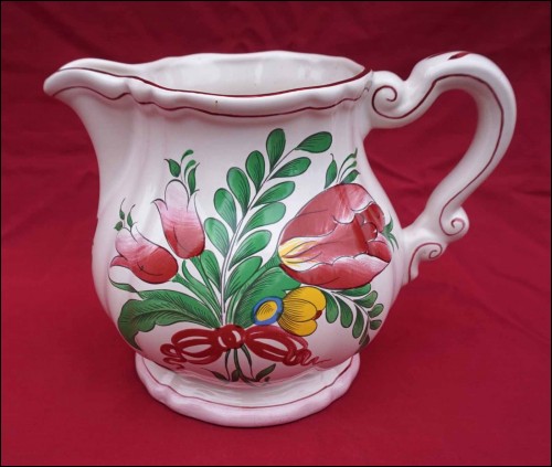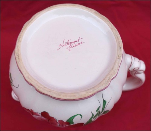 Vintage french hand painted faience pitcher showing flowers in Old Strabourg style made by St Clement during the 1960's. IIt's signed on the back ST Clement FRance. 6 1/2" (16.5cm) height, 9 1/2" (24cm) width handle to the spoot. Perfect condition as shown by the following pictures.