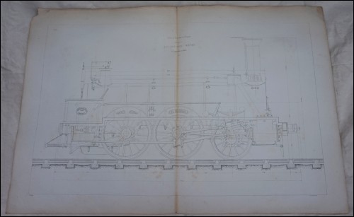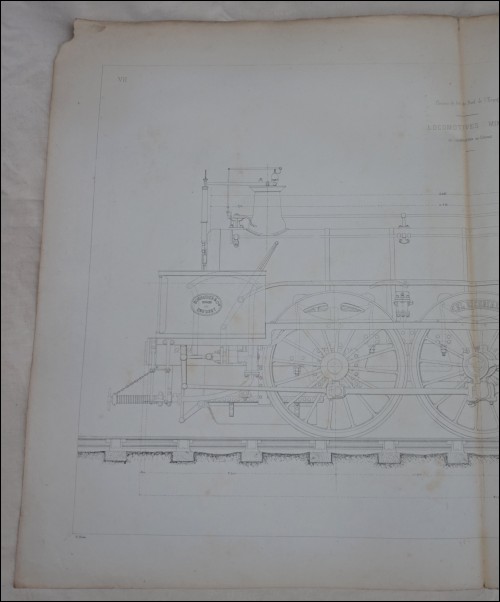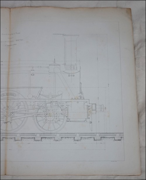 El Escorial 106 Locomotive mixte en construction en 1859 au Creusot atelier Schneider et Cie, pour les chemins de fer du Nord de l'Espagne 430. Lithographie Larcher, plan en élévation milieu du XIXème siècle. Provenance: Fond de Mr François Prosper Jacqmin (1820-1889), Polytechnicien, ingénieur au corps Impérial des Pont et Chaussées, professeur et président de l'école, et directeur d'exploitation de la Cie des Chemins de Fer de l'Est. Bon état, papier frais, salissures sur les bords, petites déchirure au plis. Hauteur 71 cm, largeur 107 cm.