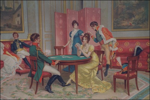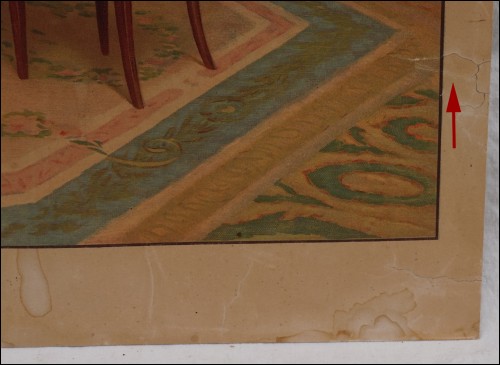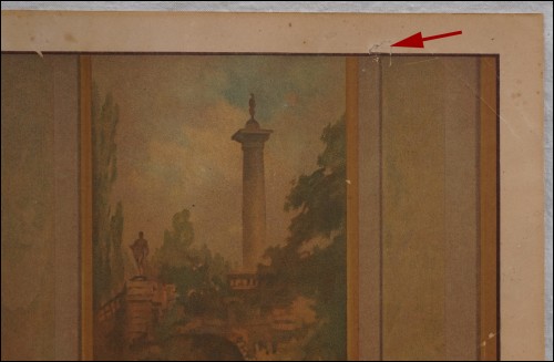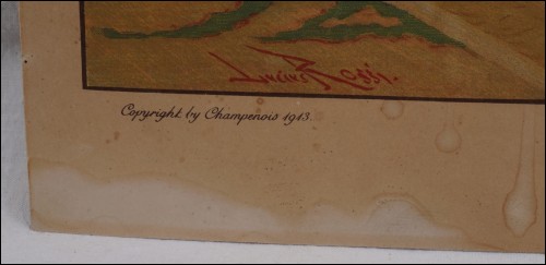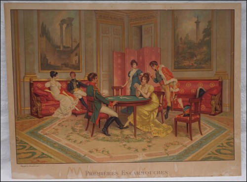 Premières escarmouches, lithographie de l'italien Lucius ROSSI (1846-1913) Gravure en couleurs représentant une scène de salon sous le 1er Empire : jeunes officiers et dames en marivaudage. Edition Champenois imprimeur (1875-1920) imprimeur, illustrateur. Dans l'état, papier collé sur carton, deux petites déchirures et salissures de condensation en marge et en bas. Fond de carton d'encadrement d'origine 1914. Signée en bas à gauche et datée 1913. Largeur 69,5 cm, hauteur 52 cm.