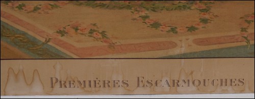 First Skirmishes " Premières Escarmouches" lithography showing french Empire ling room scene made by Lucius Rossi (1846-1913) print by Champenois in 1913. It's signed and date in the left bottm corner. 27 3/4" (69.5cm) by 20 1/2" (52cm). Good condition two small tears and condensation stains on the bottom as shown by the following pictures.
