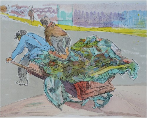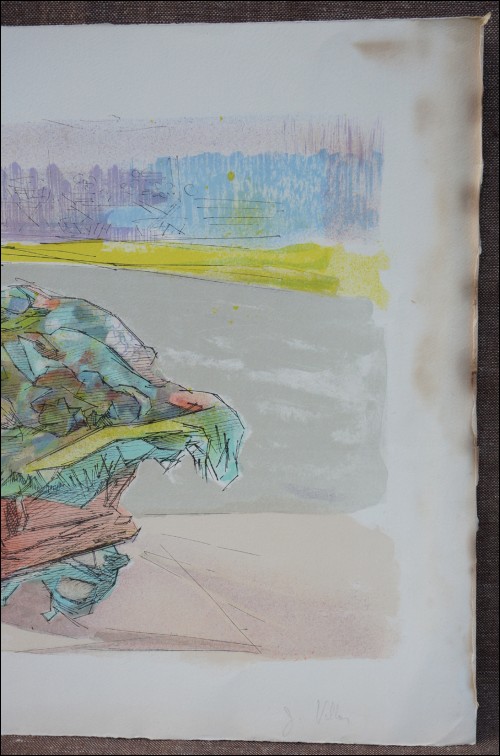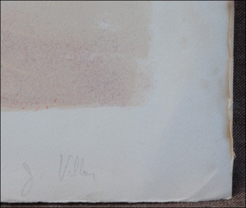 Jaques Villon (1875-1963) Marchands des Quatre Saisons 1960-62, lithographie en couleur signée J Villon. Vue en bon état, planche cornée en haut à gauche et en bas à droite, salissure à droite. Pour la feuille : hauteur 40, largeur 60 cm, pour la vue : hauteur 36,5 cm, largeur 57 cm. Le catalogue raisonné indique seulement 18 épreuves signées de cette planche.