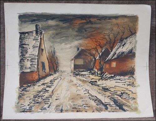 Paysage de Maurice De Vlaminck Lithographie couleur originale Presse Mourlot 1958. Bel état , non émargée, deux taches et une petite déchirure à droite, un angle corné. Hauteur 45 cm, largeur 58 cm.