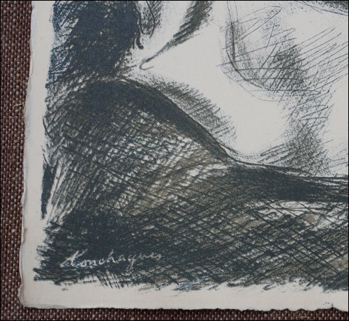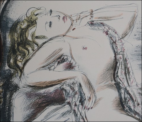 Lithographies originales érotique de Louis Touchagues (1893-1974) pour Odes en son honneur de Paul Verlaine en 1948. Une des 8 pleines pages sur vélin de Lana, tirées par Mourlot frères, 170 exemplaires numérotés. Épreuve avant tirage, signée, bel état, hauteur 38 cm, largeur 28,5 cm.