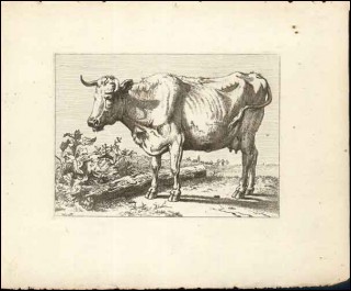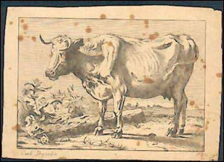Portrait de vache par Karel Dujardin, né probablement vers 1622 à Amsterdam et décédé à Venise en 1678. Le biographes ne sont d'accord ni sur le lieu ni sur la date de naissance et ses signatures sont tellement diverses, que seul la qualité du travail ne nous fait pas douter de l'artiste flamand. Une gravure à l'eau forte avant les lettres, et une des premiers tirages, nous assurent la véracité de l'oeuvre. Bon état, quelques mangeures de vers. Hauteur 9.8cm de la partie gravée, largeur 13.8cm.