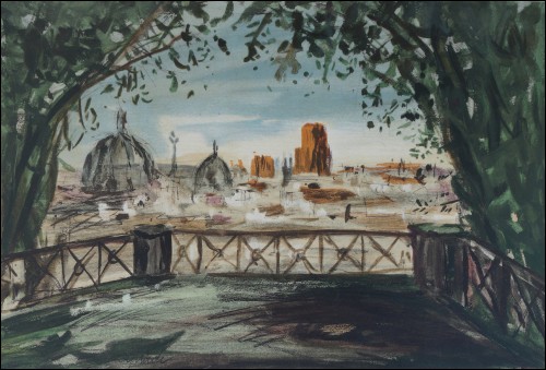 Rome, depuis la colline du Palatin, lithographie de Pierre Laprade (1875-1931). Bel état, petite déchirure en bas de page. Hauteur 32,5 cm, largeur 45 cm. Pour la vue : hauteur 26 cm, largeur 38 cm.