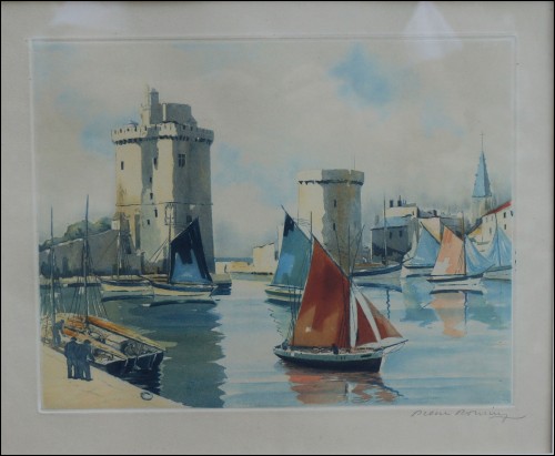 Le port de La Rochelle, estampe couleur à l'eau forte de l?aquarelliste graveur Pierre Roussin XXème siècle, épreuve signée en bas à droite. Bel état, rares rousseurs. Partie gravée avec cuvette: hauteur 24,5 cm, largeur 31,3 cm.