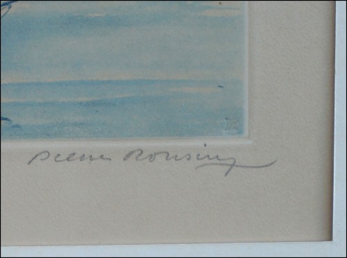 Sailing boats in La Rochelle harbour, southwest of French atlantic coast, framed colored etching made by Pierre Roussin during the 20th century. It's signed on the right corner. Good condition rare yellowish stains as you can see on the pictures below . Size of the etching: 9 5/8" hight 12 3/8" width.
