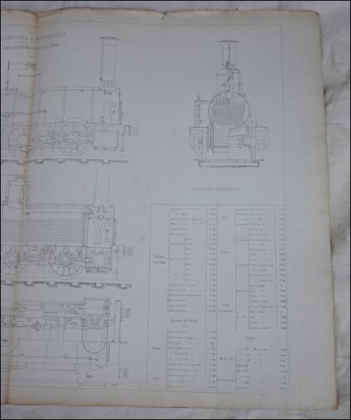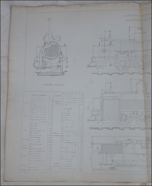 French steam engine merchandise locomotive n° 201 made by Schneider & Co for the spain railways (line Madrid,Zaragoza,Alicante) sectional, elevation plan and description, lithograph print by Larcher in 1863. 42 1/8" width 28" height. Good condition, dirty on the edges, small tears on the top, fold as presented on the following pictures.