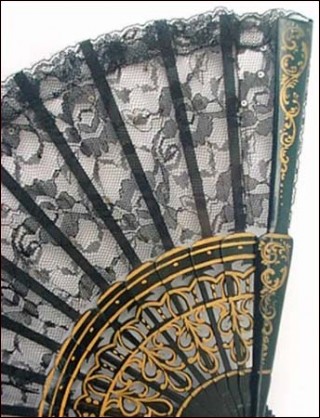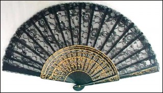 Eventail vers 1870 en dentelle sur tulle et empiècement métallique à monture bois vernis Japonais et décor doré. Bon état. Largeur ouvert 44 cm longueur 24 cm.