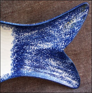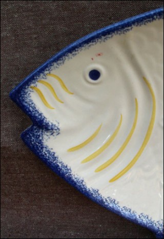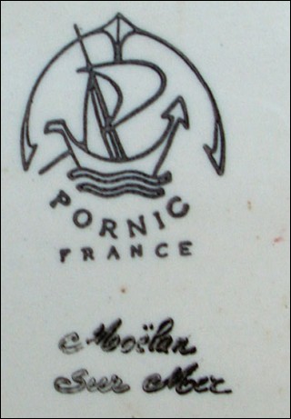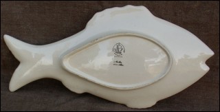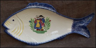 Large fish shaped platter dish with hand painted decor showing a couple of little bretons surrounded by a blue sponging border made by Pornic studio near Quimper during the 1950"s. Perfect condition, signed on the back. 22" length 10 7/8" width.
