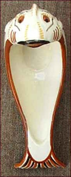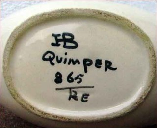This sauce boat fish shaped has been made by the famous HB Quimper factory around 1950. The hand painting pattern depicts the fish in yellow and brown. 4"1/4 tall 9" width. Good condition. Signed on the back HB Quimper with the drawer marks.