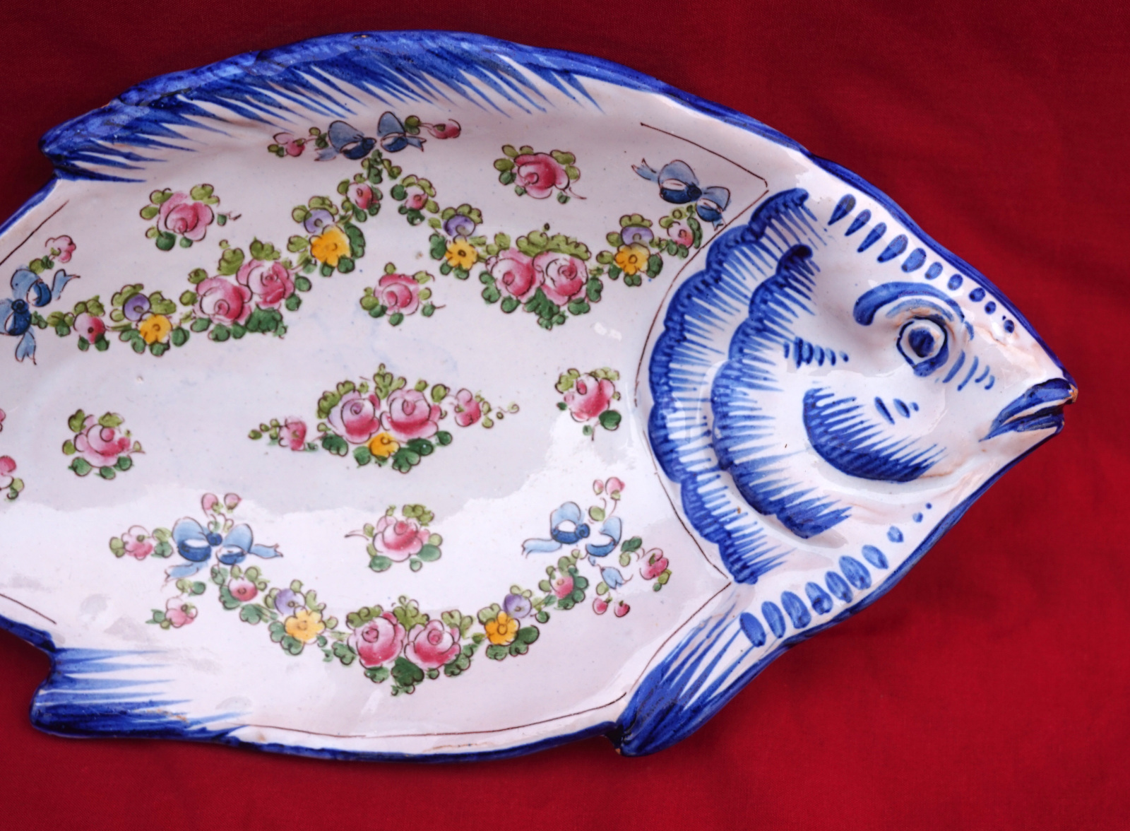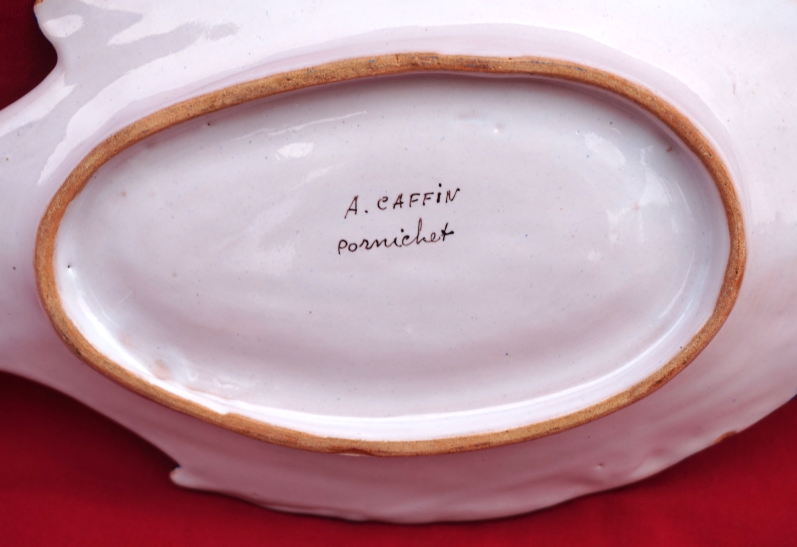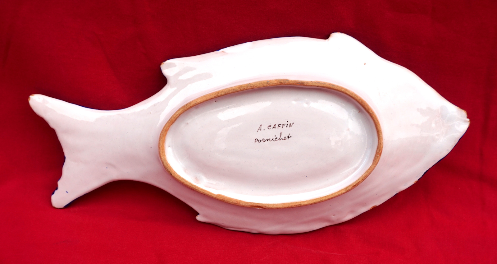 French hand painted faience fish shaped tidy small dish made by A Caffin in Pornichet near Quimper. It's signed on the back. 10 5/8" (27cm) length, 5" (12.7cm) width.  Good condition a few tiny glaze shortages.