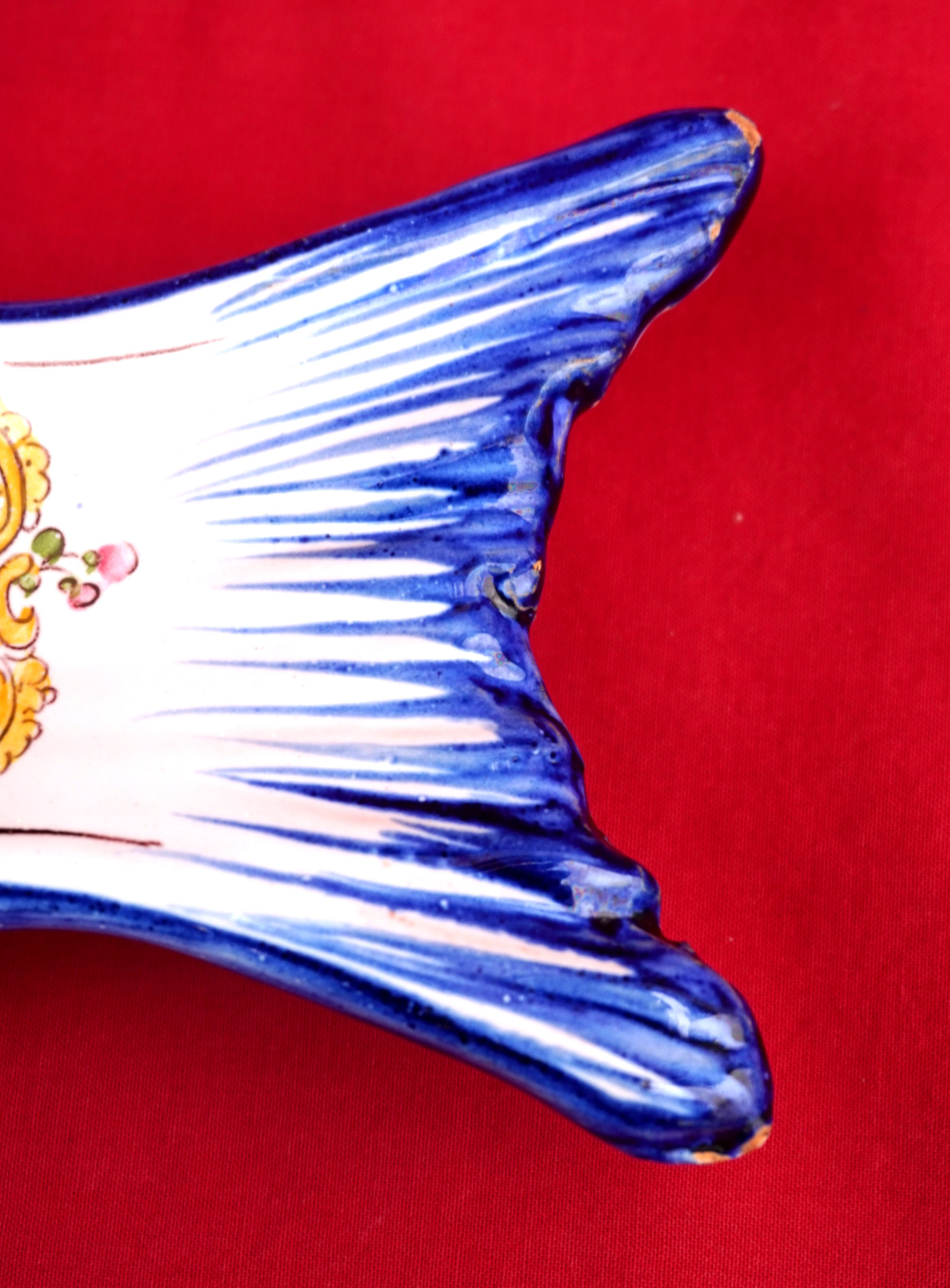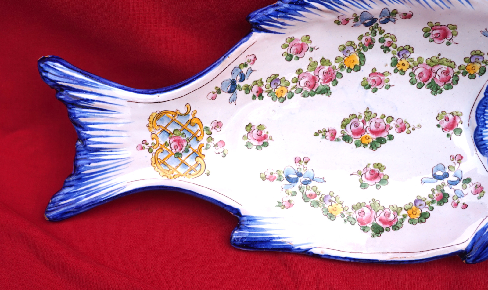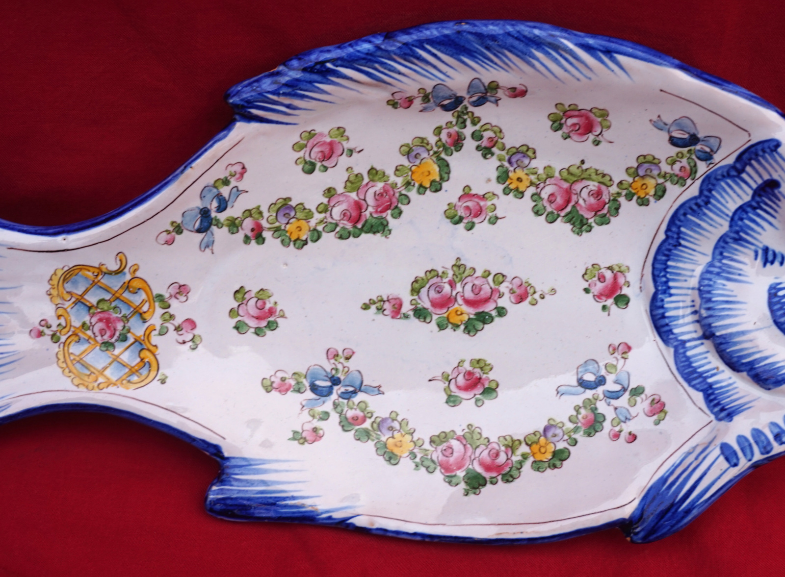 French hand painted faience fish shaped tidy small dish made by A Caffin in Pornichet near Quimper. It's signed on the back. 10 5/8" (27cm) length, 5" (12.7cm) width.  Good condition a few tiny glaze shortages.