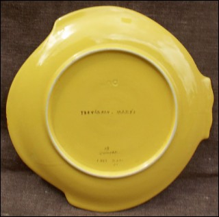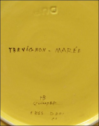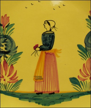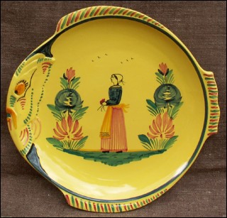 Fish shaped plate made by the famous HB Quimper factory during the 1950's. The hand painted decor shows a little Bretonne in traditionnal costume on yellow background.10" diameter. Perfect condition. Signed on the back HB Quimper with the drawer marks.