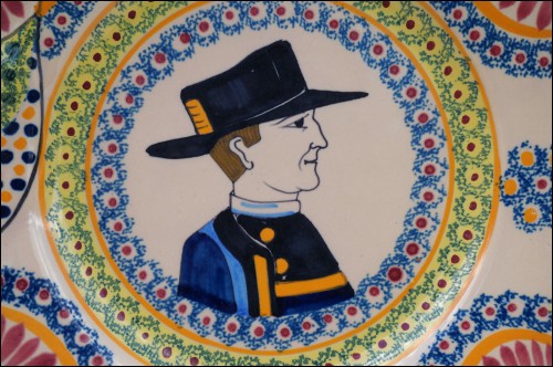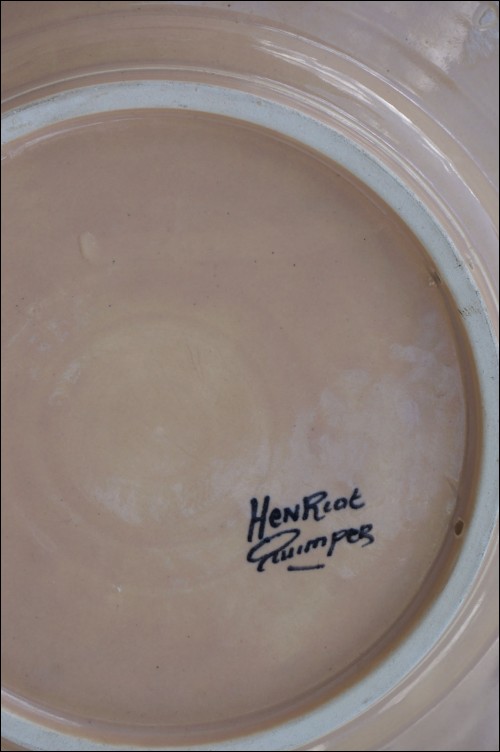 Fish shaped decorative plate with corbeille pattern made by Henriot in Quimper during the 1930's. The hand-painted decor shows a little breton in traditionnal costume. Good condition only a few glaze shortage as you can see on the pictures below. It's signed on the back Henriot Quimper. 9 3/4" diameter.