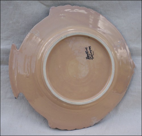 Assiette en forme de poisson de la manufacture Henriot à Quimper vers 1910. Elle est à décor corbeille. Parfait état et est signée sur son fond. Largeur 24,3 cm.