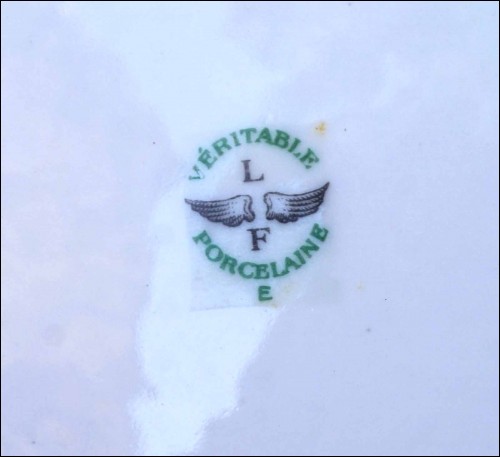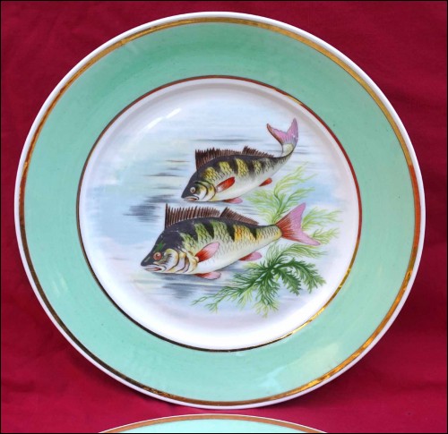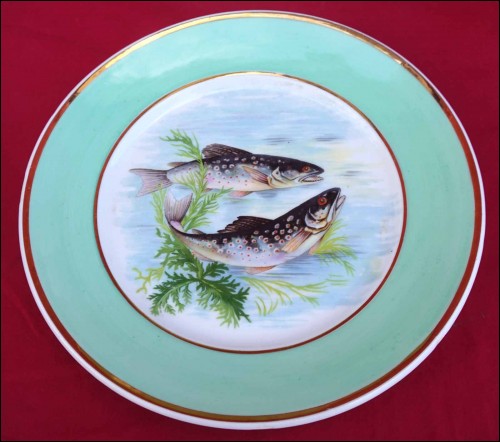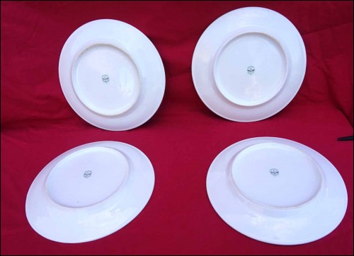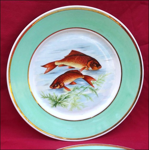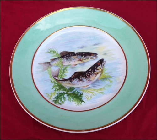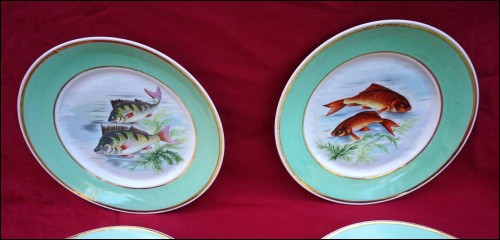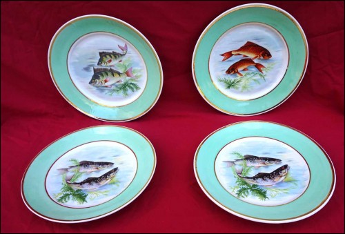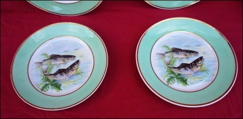 Suite de 4 assiettes ornées de poissons de rivière et rehaussées de filets d'or en porcelaine de Limoges, milieu du XXe siècle. Décor par transfert émaillé. Marque de décorateur à Limoges. Diamètre 23,5 cm. Très bel état.