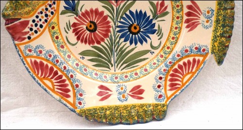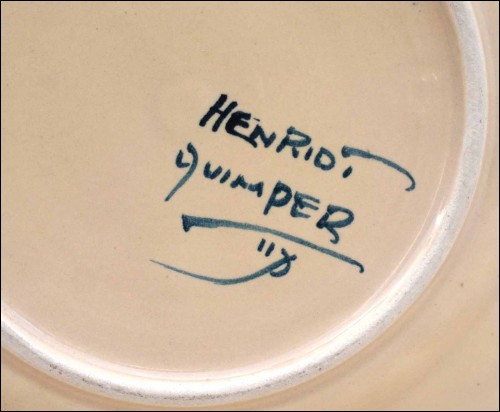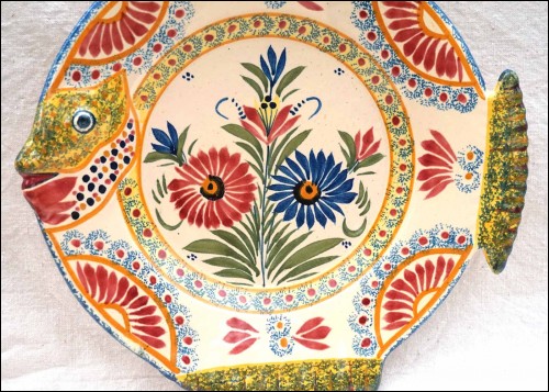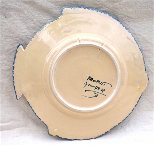 French hand painted faience fish shaped plate with corbeille decor made by Henriot in Quimper during the 1910's. It's signed on the back Henriot Quimper. 9 3/4" (24.8cm) diameter. Perfect condition no chips no cracks no hairlines as shown by the following pictures.