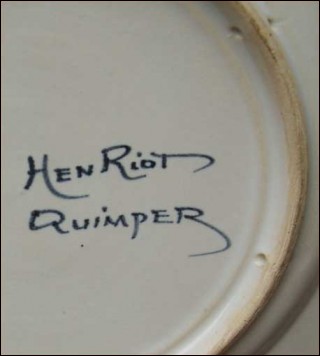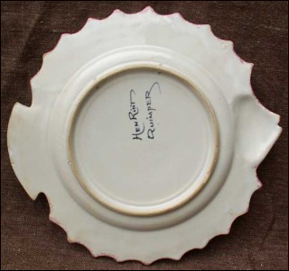 Vintage turbo shaped plate in French majolica made by the famous Henriot factory in Quimper during the 50's. The hand painting pattern depicts traditional flowers suroounded by a granite rose border on a white background. Perfect condition. It's signed on the back Henriot Quimper. 9" diameter.
