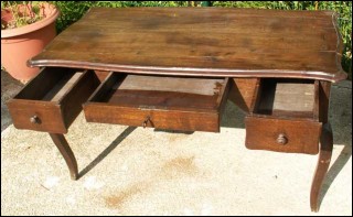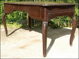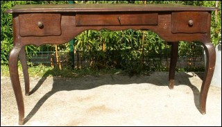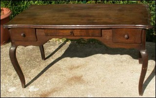 Table bureau de style Louis XV, vers 1910. Il est en bois de châtaigner massif, ouvrant par trois tiroirs. Son dessus est mouvementé, ainsi que ses traverses. Les têtes des pieds galbés sont chevillées. Les tiroirs sont montés à queues d'aronde.