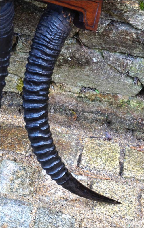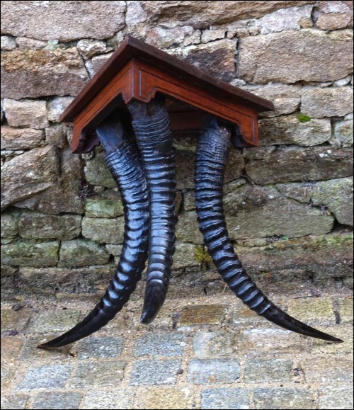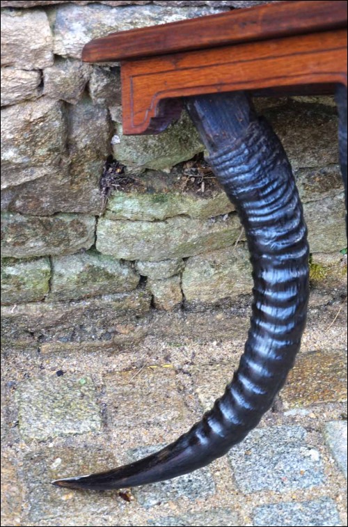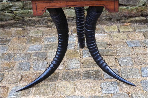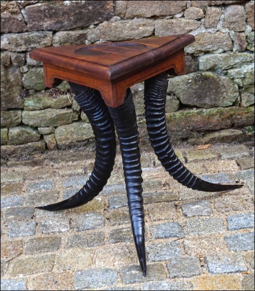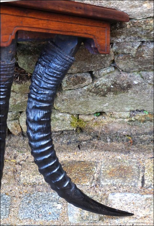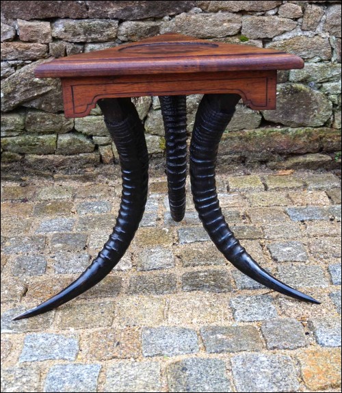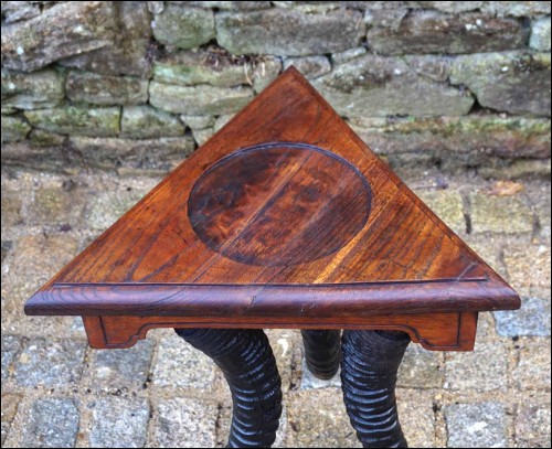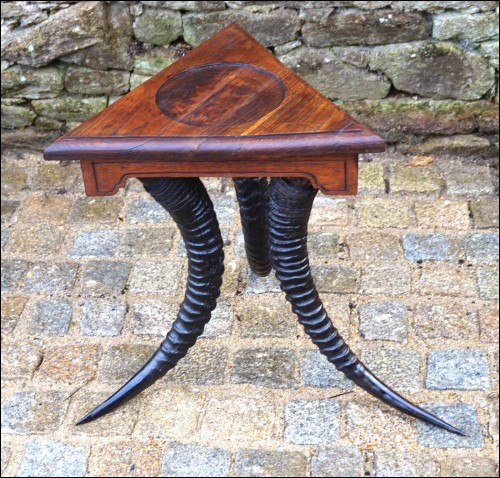 Petite table basse tripode reposant sur trois cornes d'Ibex, Forêt Noire début XXe siècle. Hauteur 53 cm, largeur 48 cm par coté, poids 5.437 kg. Très bel état.