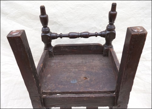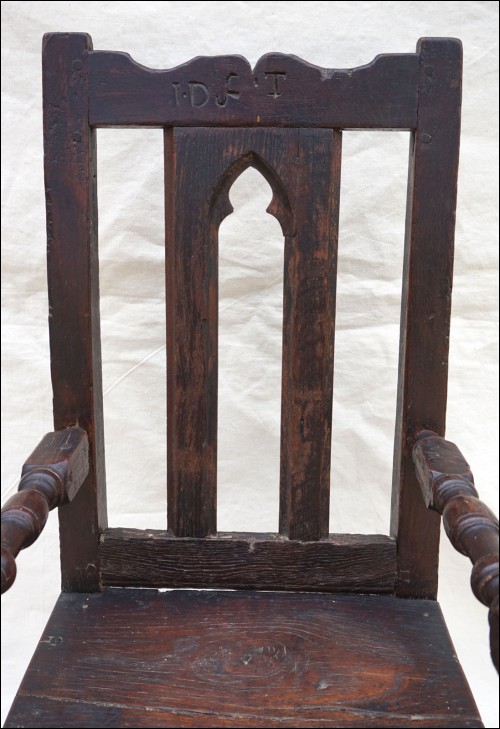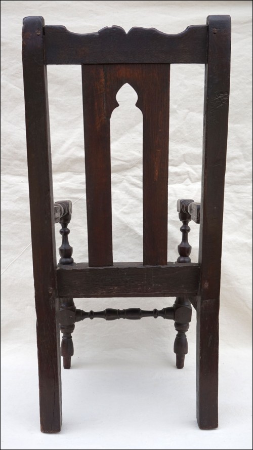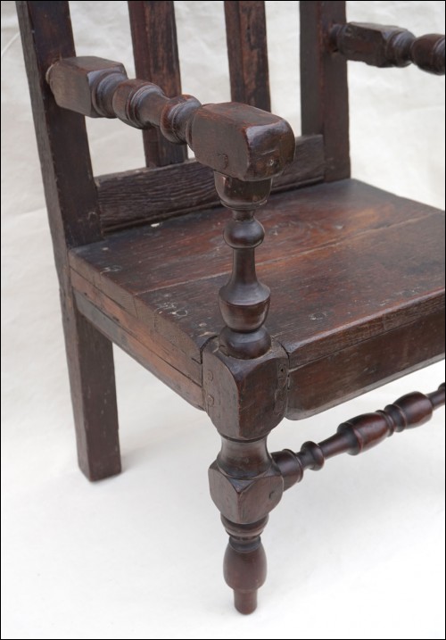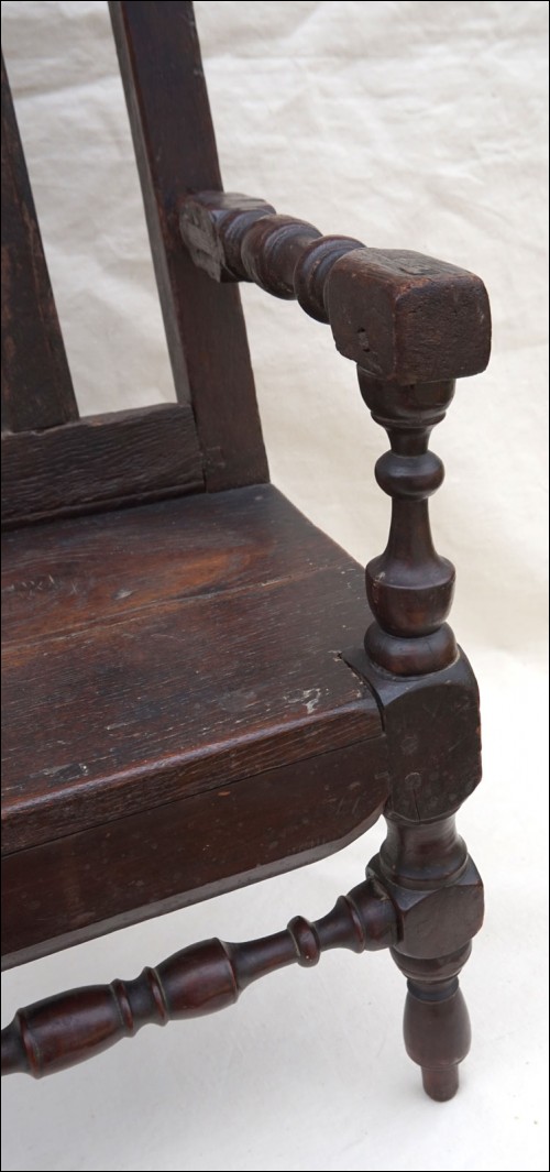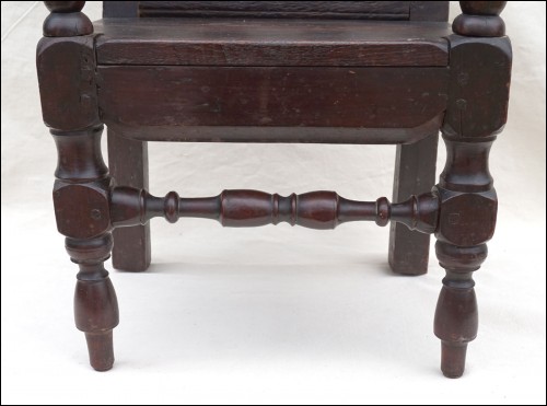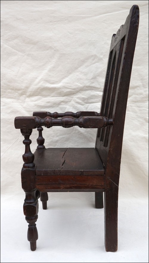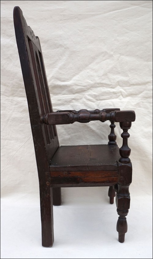 Antique gothic revival child throne armchair in turned oak and fruit wood with ID and St engraved monogram made early 18th century.29 1/8" (74cm) height 10 5/8" (27cm) seating height 13 1/4" (33.5cm) width 11" (28cm) depth. Beautiful patina and condition an old repair on one arm as presented on the following pictures.