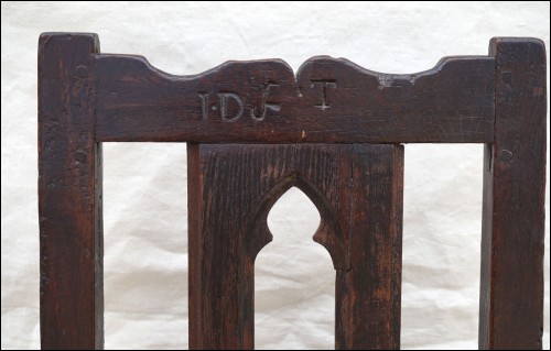 Fauteuil d'enfant de style gothique en bois fruitiers avec gravure nominative, début du XVIII° siècle. Restaurations à un bras, en bel état, petits égrenures d'usage. Hauteur totale 74 cm, largeur 33,5 cm, profondeur 28 cm, hauteur d'assise 27 cm.