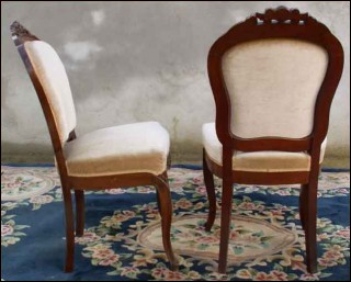 Paire de chaises d'époque Napoléon III en palissandre massif et de rapport, vers 1860. Bon état général, petites cloques en ceinture, restauration à un des dossiers (voir photo), garniture récente. Hauteur totale 89 cm, hauteur assise 46 cm, largeur 46 cm, profondeur 42cm.