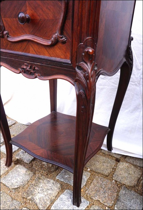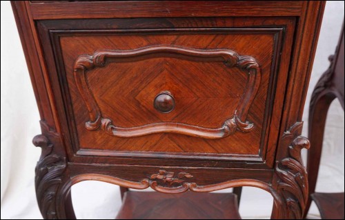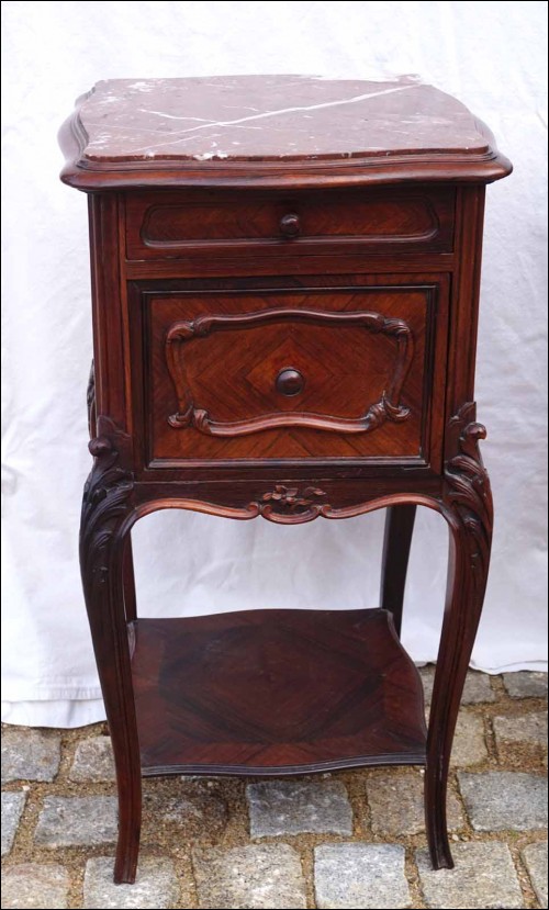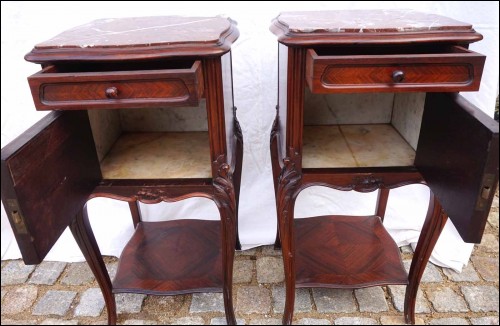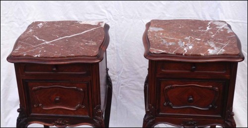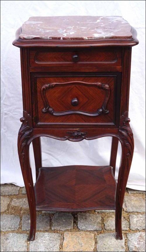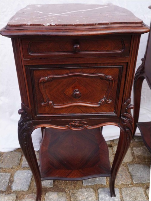 Antique french carved rosewood and red marble top night stand or side table in Louis XV style made during Napoleon III area, 1860's. They are in solid carved and veneered rosewood, on the top red marble and inside white marble interiors. They open with dovetailed drawers and stand on cabriole legs. 29 1/2" (75cm) height , 15" (38cm) by side. Beautiful condition and patina, no chips or cracks or damages, as shown by the following pictures.