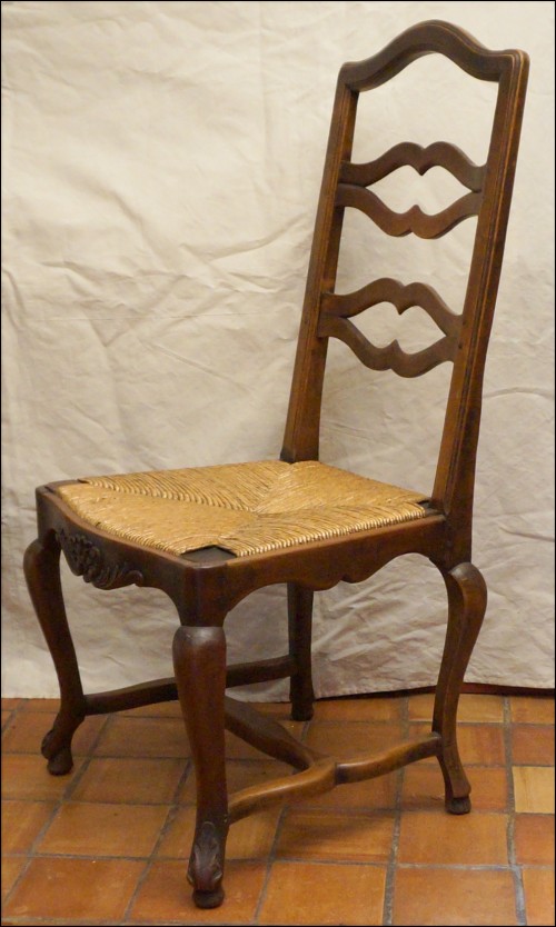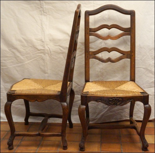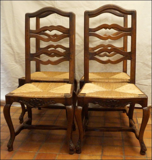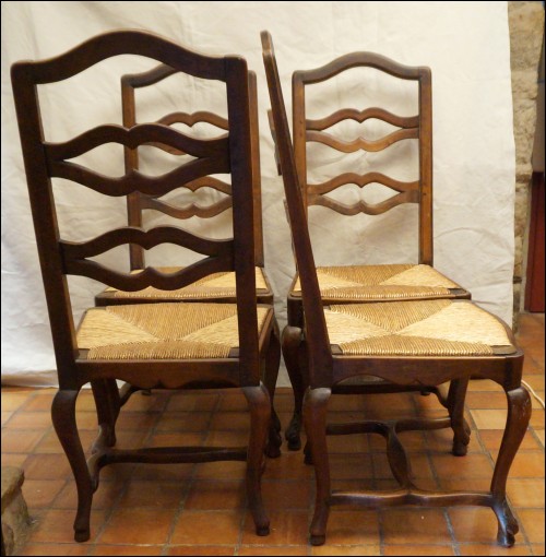 Set of 4 Louis XV style provencal dinning chairs in carved walnut and woven rush seat with ladder back and cabriole legs made in France late 19th century. Good condition, the rush seat are slightly used as you can see on the pictures below. 44 7/8" high overall 18 7/8" seating high 20 1/2" width 19 3/4" depth.