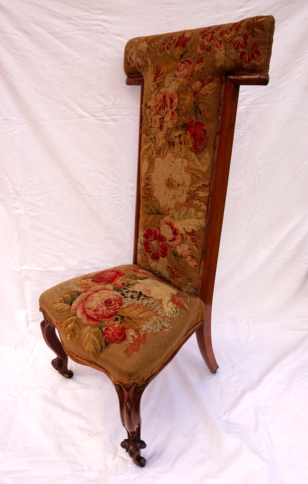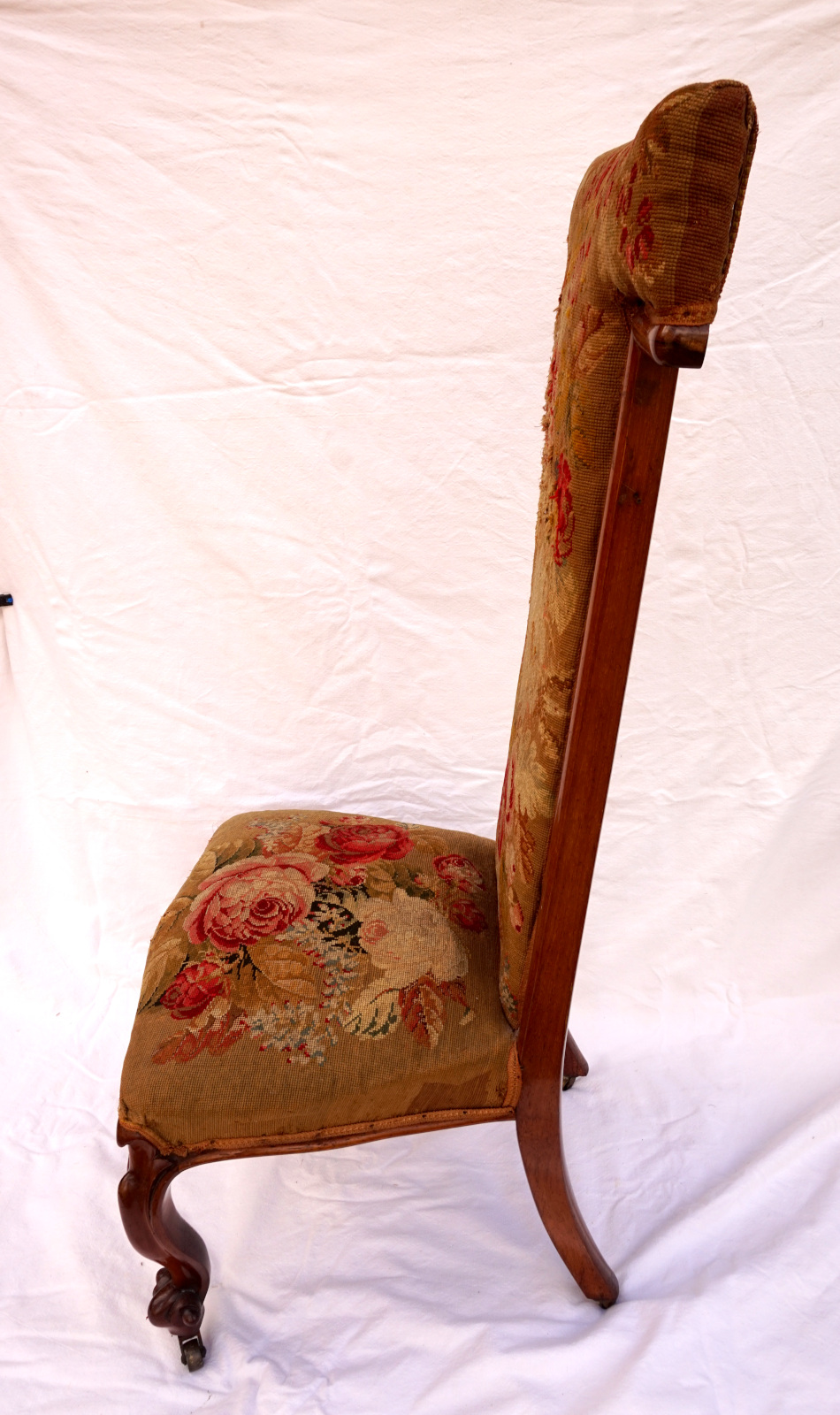 Victorian carved rosewood nursing or prayer chair with high T sheped back and upholstered with needlepoint tapestry circa 1860. The chair stands on cabriole legs ended with casters. 43 1/2" (110.5cm) total height, 15 3/8" (39cm) seat height, 18 78" (48cm) width, 16" (40.6cm) dept. Beautiful condition for the chair and the carved wood , the needlepoint tapestry is used.