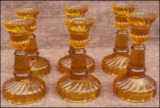 Set of 6 miniature candlesticks in french amber pressed glass Portieux made during the 1920's. Very good condition. 3 3/4" high.