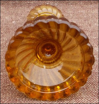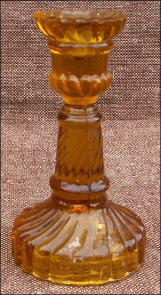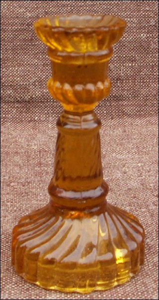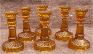 For our French-speaking friends Six bougeoirs de table en verre pressé ambré, Portieux vers 1920. Ils sont en bel état. Hauteur 9,3 cm.