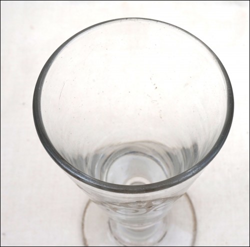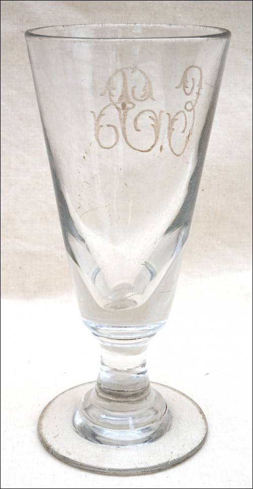 Grand verre à absinthe gravé du monogramme de son propriétaire EB, en verre soufflé épais milieu XIXe. Hauteur 18,5 cm, diamètre 8,5 cm.Très bel état, pontil meulé, traces d'usures au pied et au col.