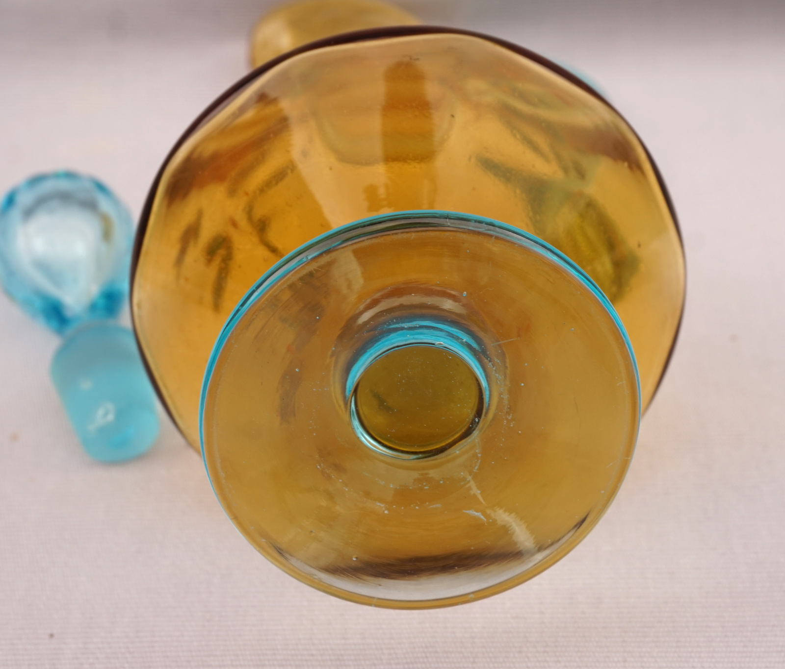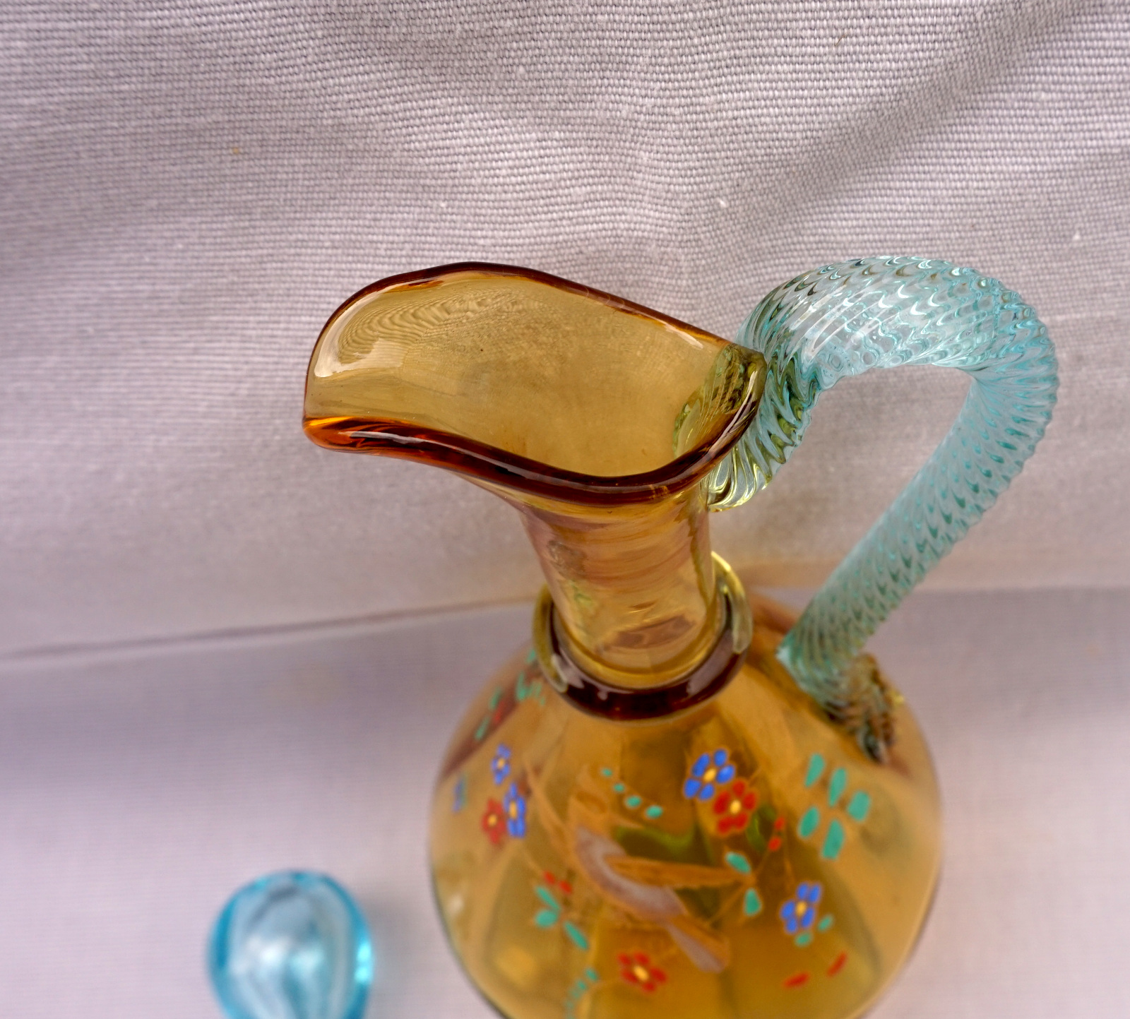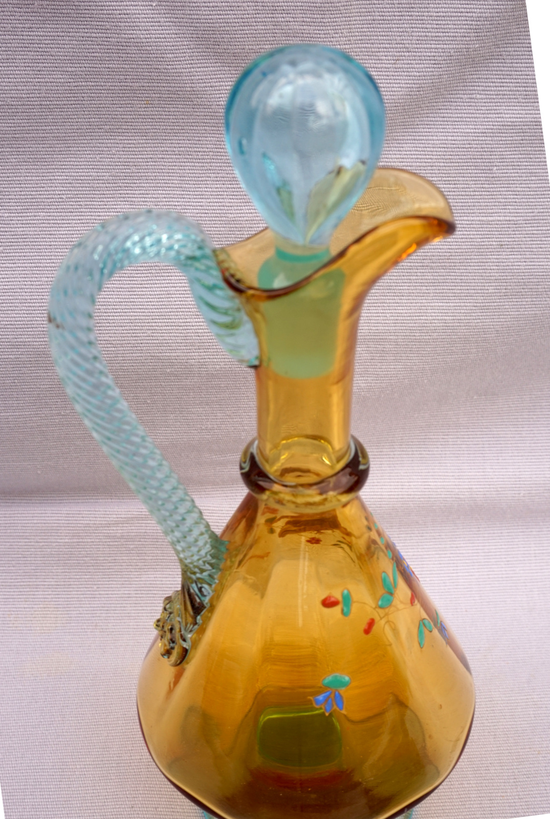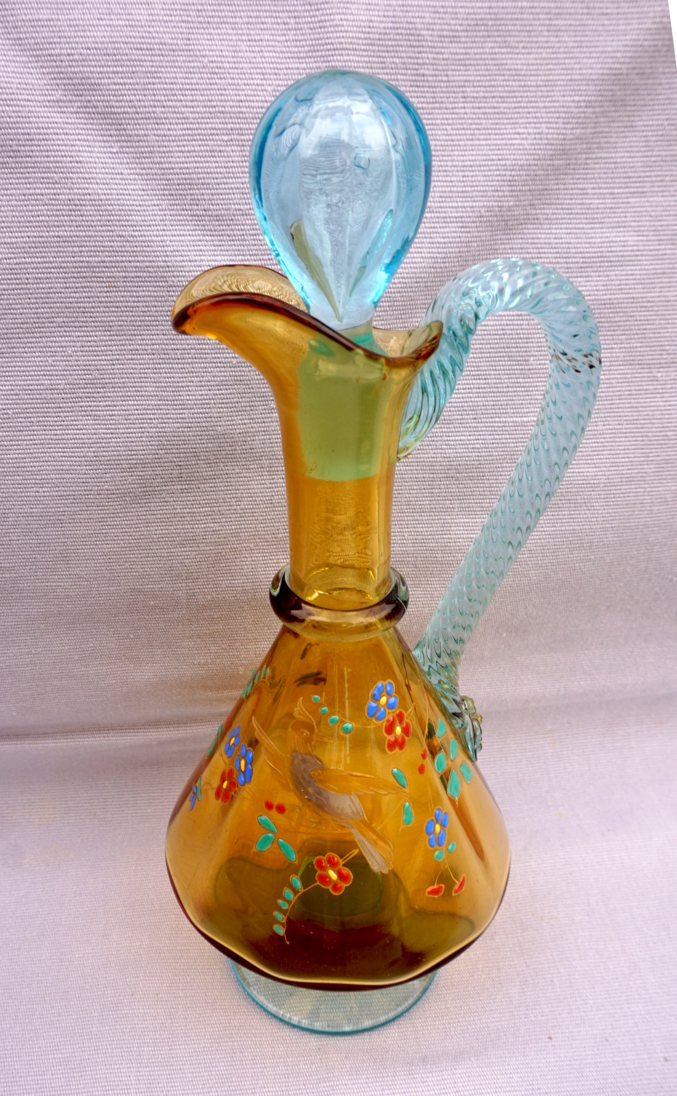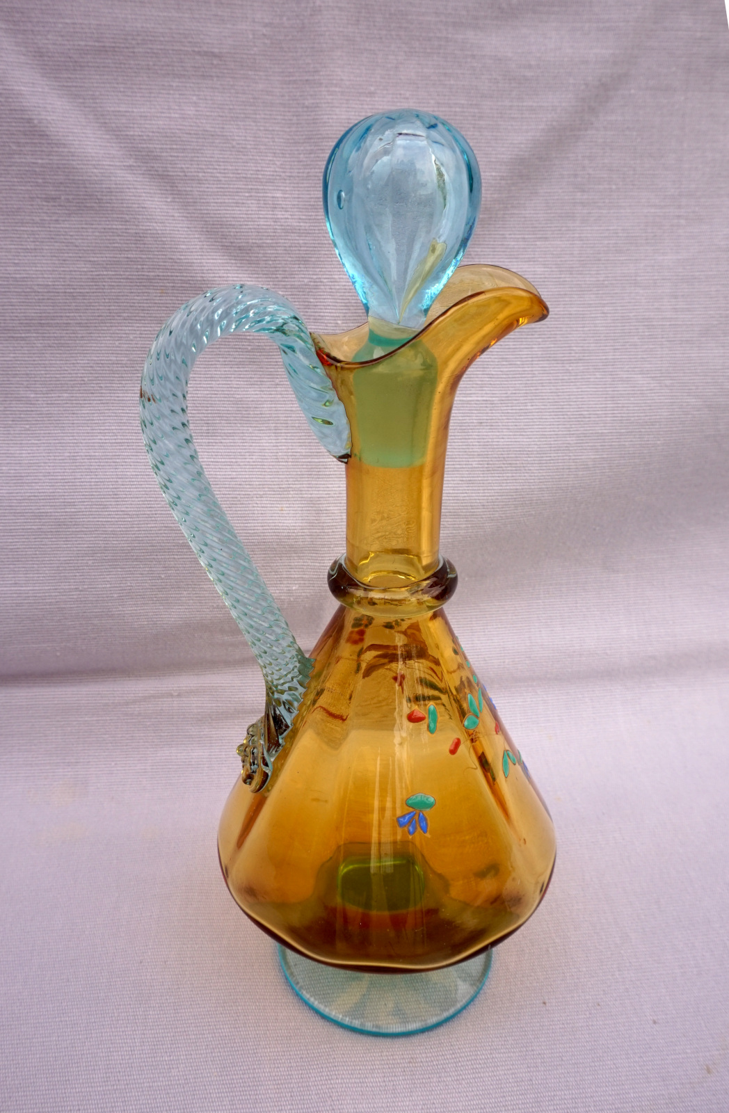 French Art glass blue amber enameled cruet with stopper a,nd handle twisted made by Portieux during the 1900's. 9" (23cm) height, 3 3/4" (9.5cm) diameter to the body. Perfect condition.
