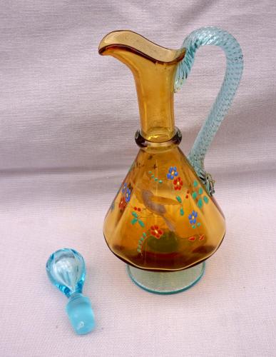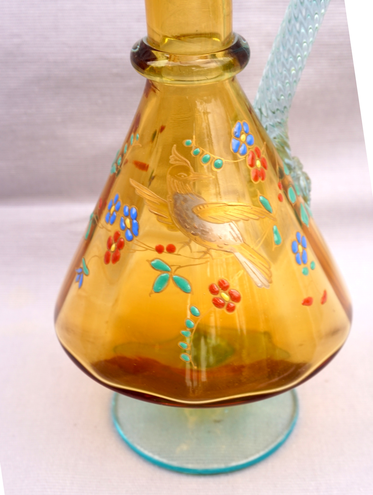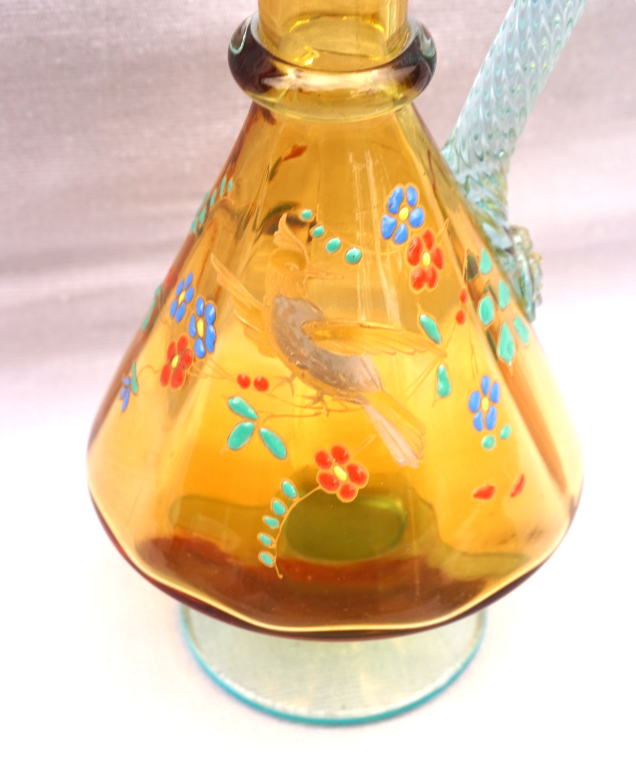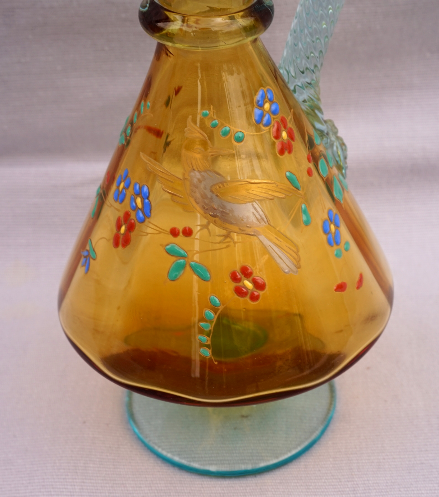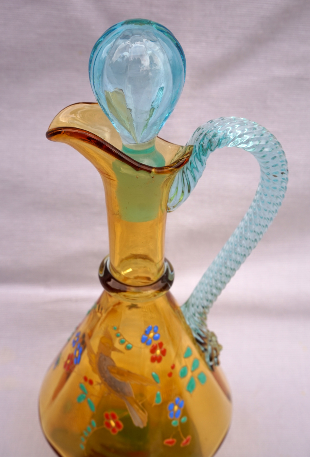 Art Glass Blue Amber Enamel Bird Crystal Cruet w Stopper Portieux 1900's