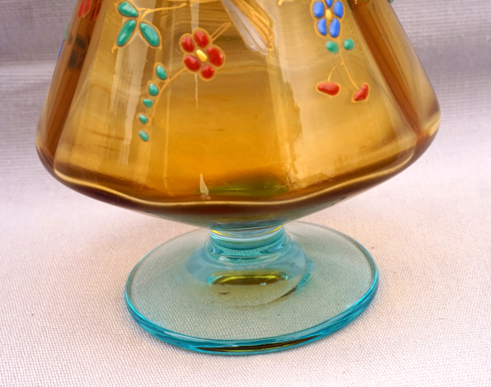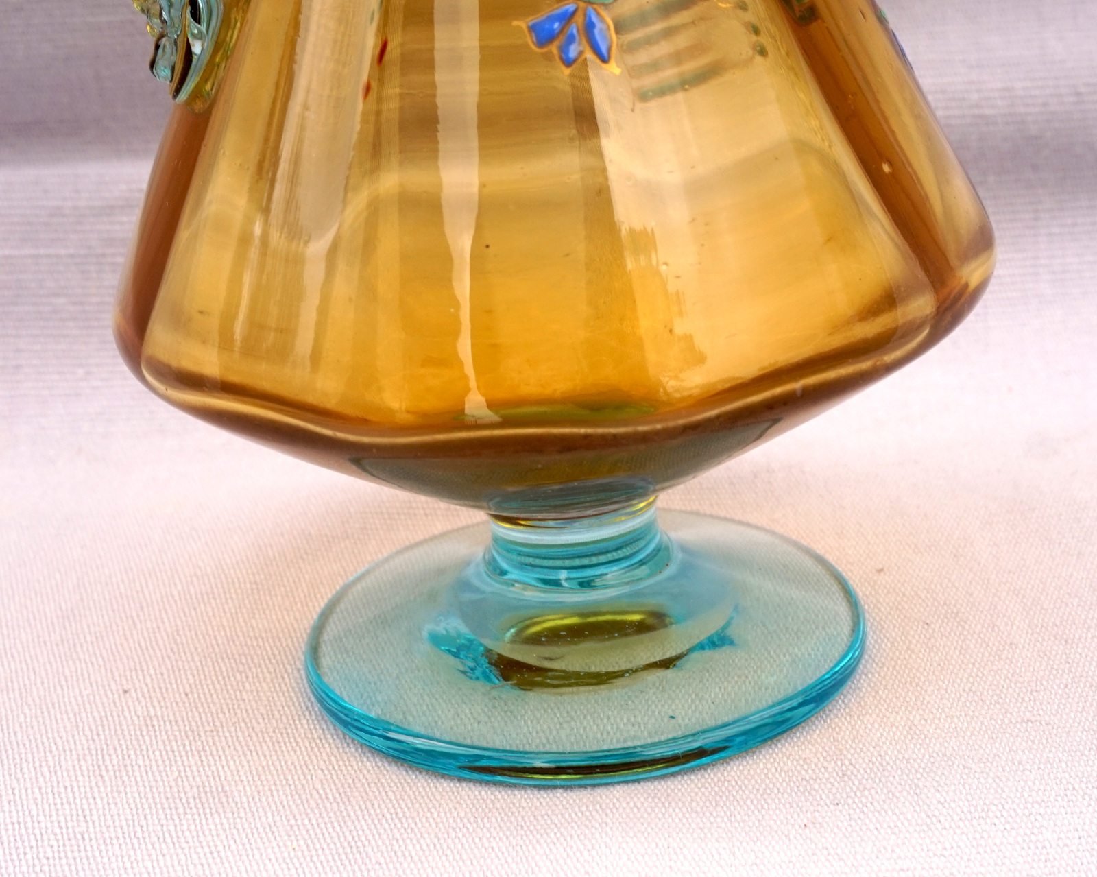 Petit pichet en cistal bleu azur et ambre réhaussé d'émaux par la verrerie-cristallerie de Portieux vers 1900. Hauteur 23 cm, diamètre au corps 9.5 cm. Parfait état.