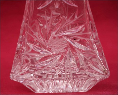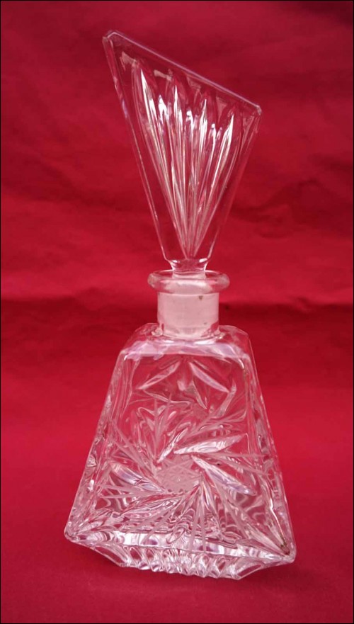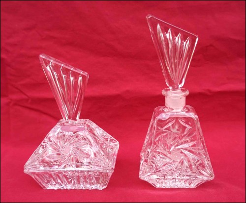 Un flacon à parfum et une boite en cristal de Bohème gravé à l'étoile, époque Art Déco. Très bel état. Dimensions pour le flacon : hauteur 14,5 cm, largeur 7,5 cm, profondeur 5,3 cm; pour la boite hauteur 14,5 cm, largeur 9,2 cm, profondeur 6,1 cm.