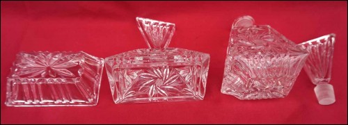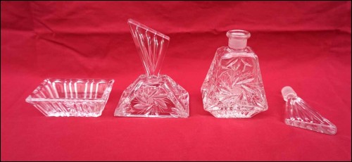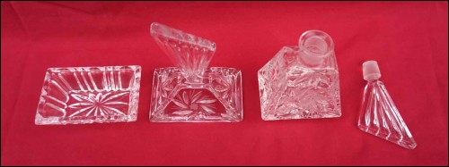 Bohemian art glass engraved crystal perfume bottle and powder box made during the Art Deco period. They measure for the perfume bottle: 6 7/8" (17.5cm) height, 3" (7.5cm) width, 2 1/8" (5.3cm) depth. Perfect condition as shown by the following pictures.