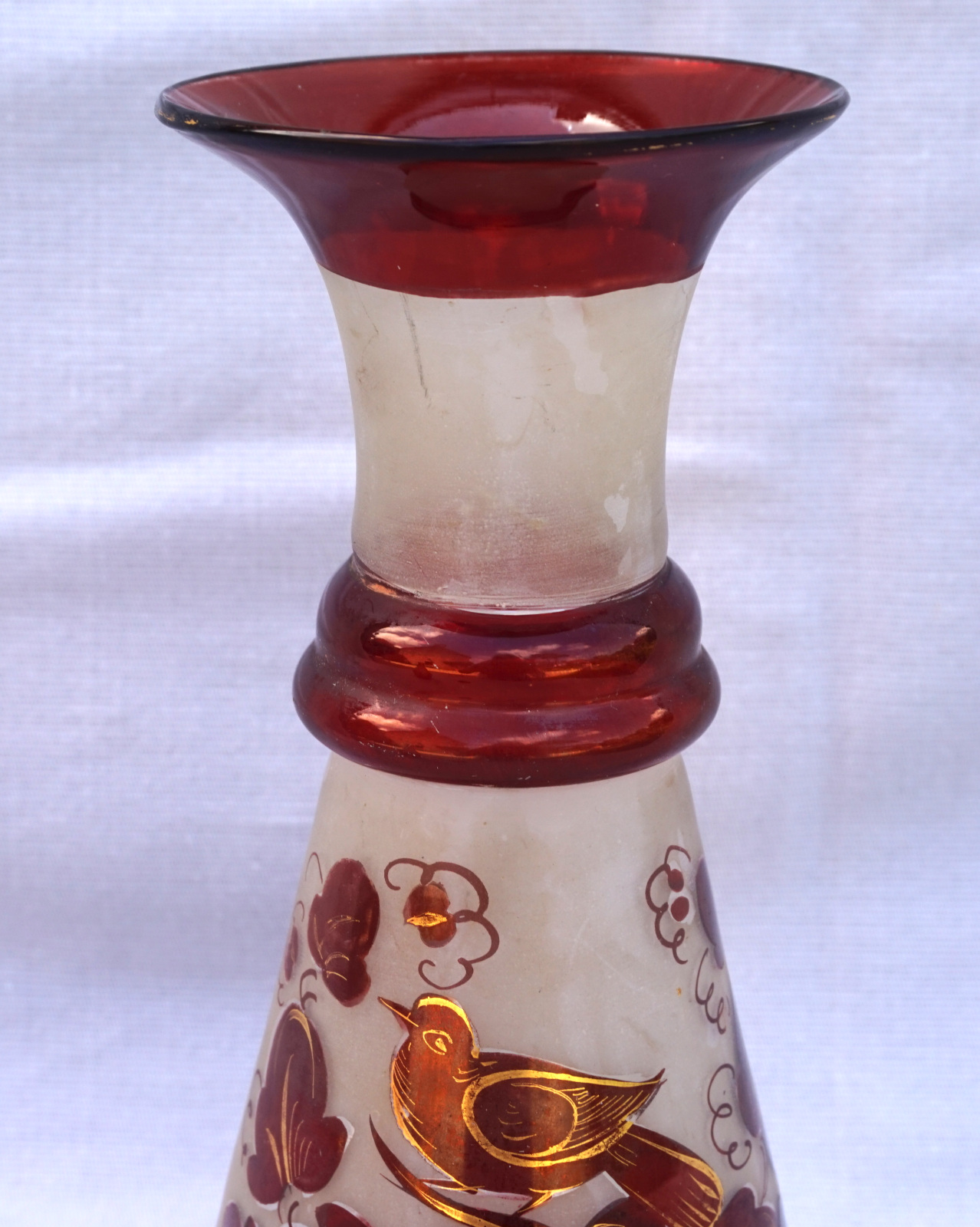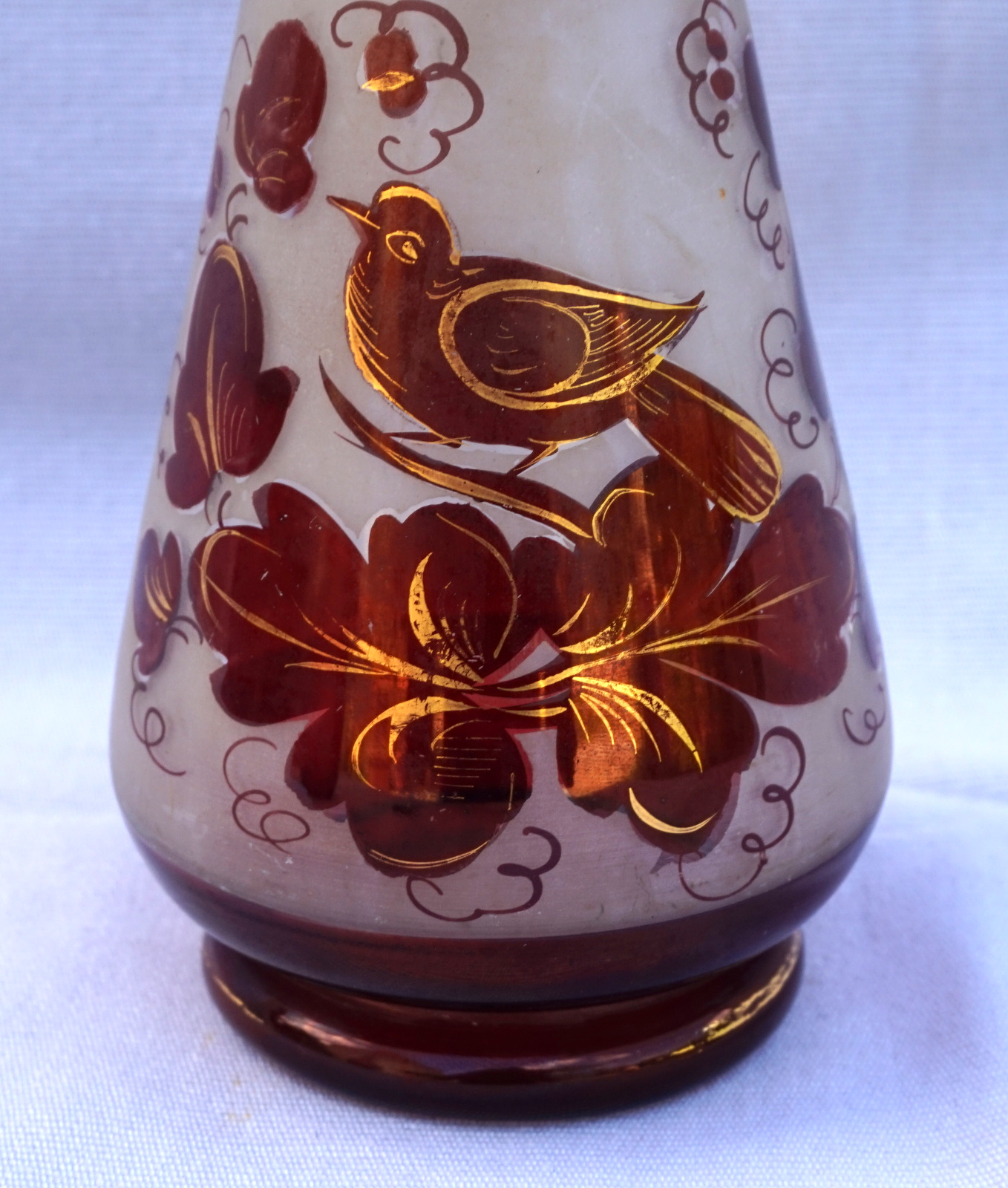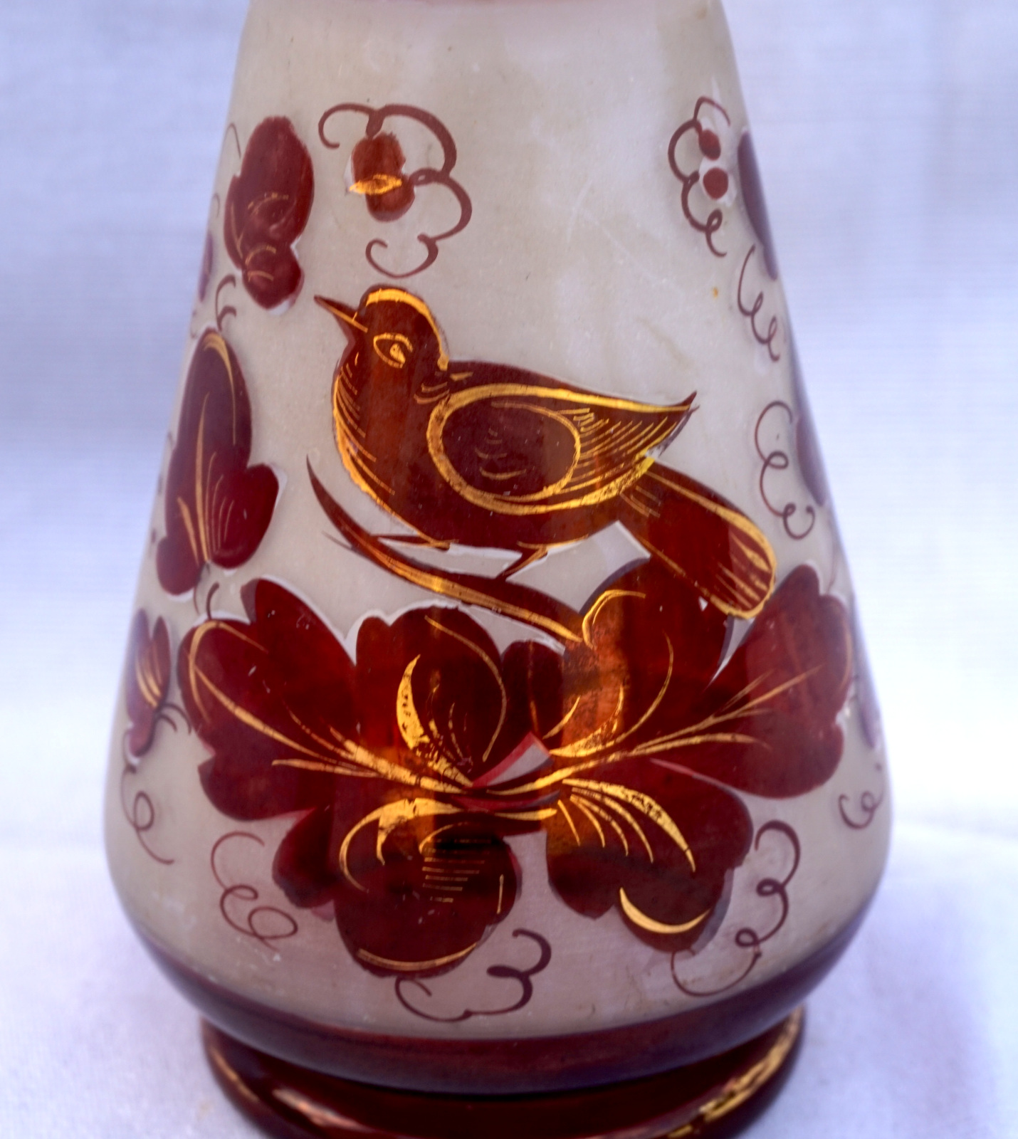 Czech Art Glass ruby red with gilt hand painted bird with foliage on frosted glass vase made early 20th century. 7 7/8" (20cm) height, 3 1/4" (8.3cm) diameter to the body. Perfect condition.