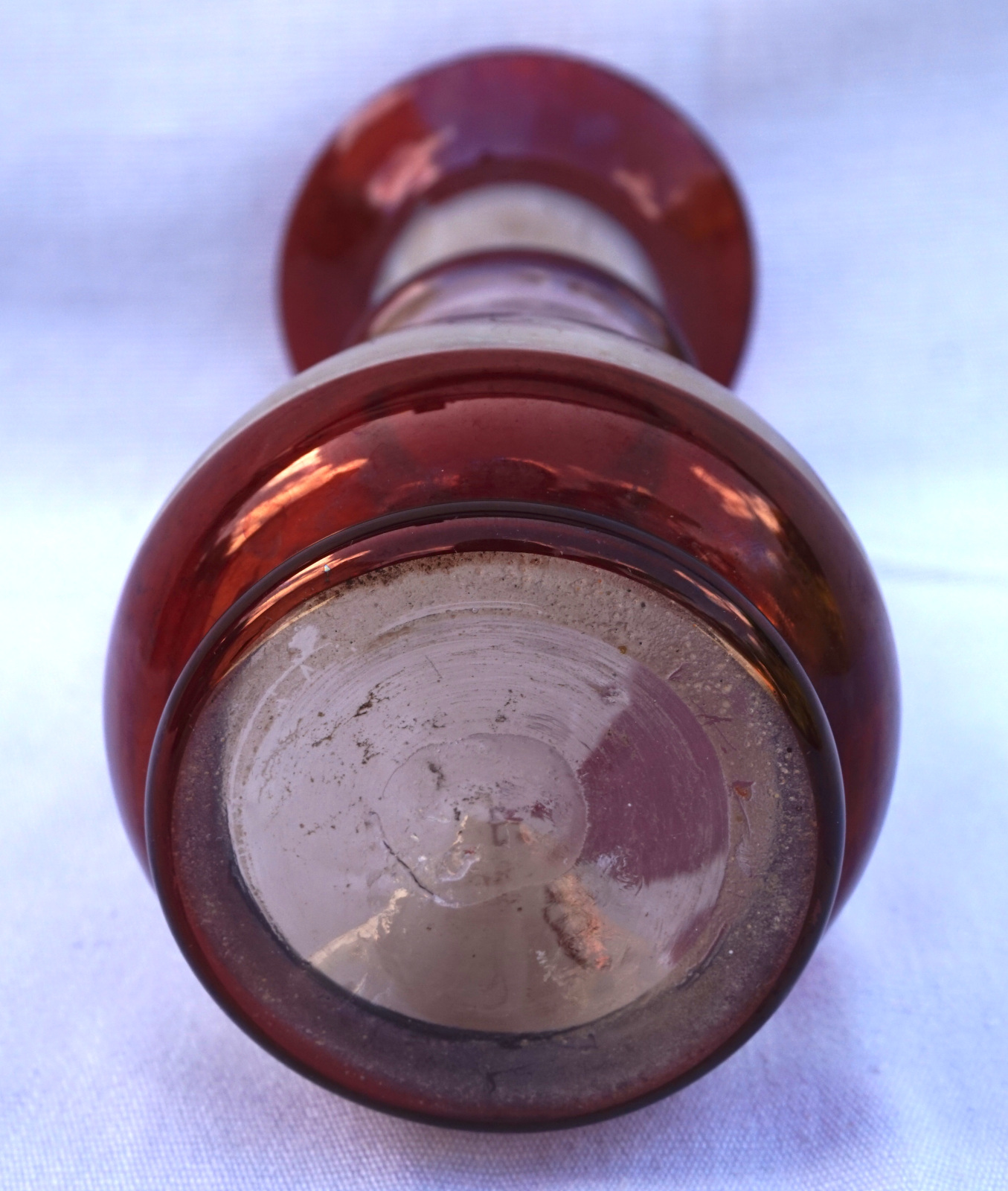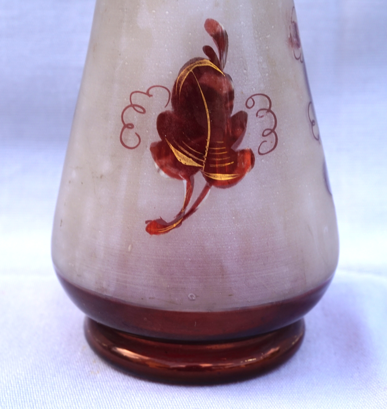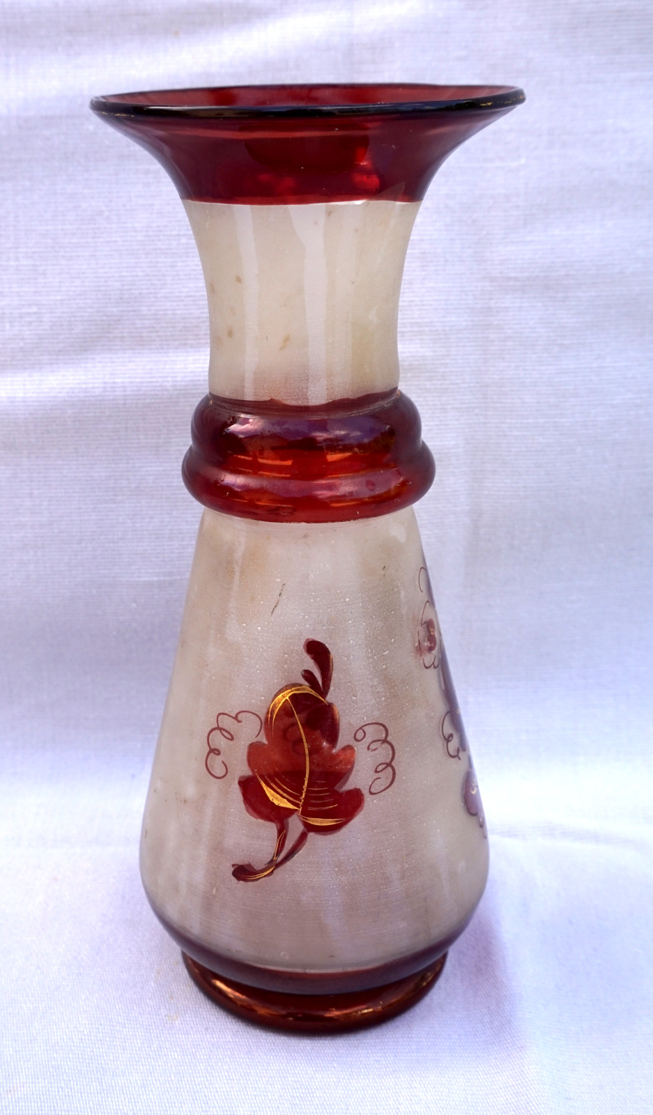 Czech Art Glass ruby red with gilt hand painted bird with foliage on frosted glass vase made early 20th century. 7 7/8" (20cm) height, 3 1/4" (8.3cm) diameter to the body. Perfect condition.