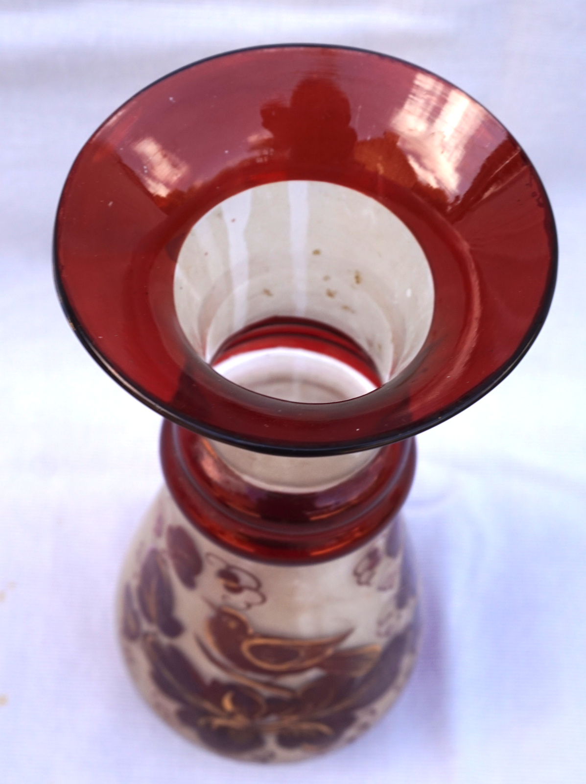 Vase en verre soufflé rubis réhaussé or orné d'un décor d'oiseau sur un fond dépoli, république Tchèque première moitié du XX° siècle. Hauteur 20cm, diamètre au corps 8.3 cm. Parfait état.