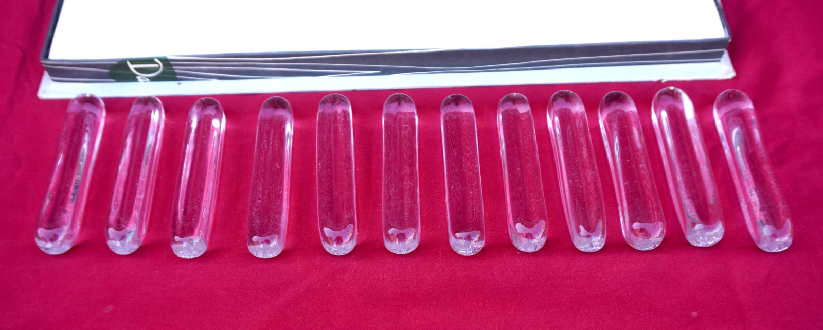 Ensemble de12 porte-couteaux en cristal signés Daum France, dans leur boite d'origine. Longueur 9 cm, 2cm par côté.  Très bel état.