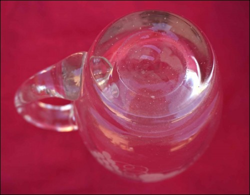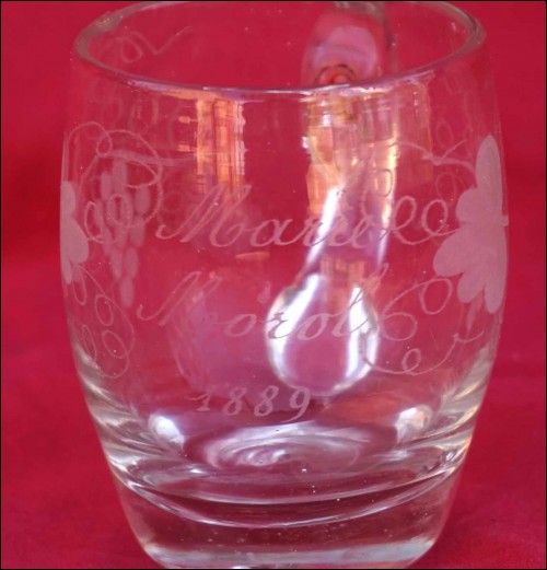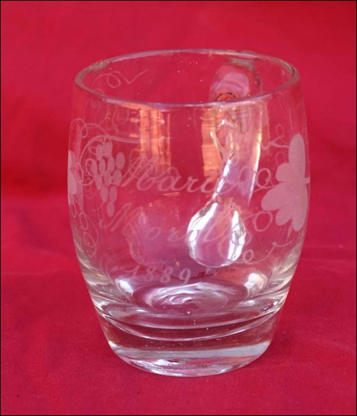 Verre de dégustation gravé de vigne, grappes et feuillages, pour Marie Morol 1889. Diamètre 6,8 cm, largeur avec l'anse 10,2 cm, hauteur 9 cm. Très bel état, pontil meulé.