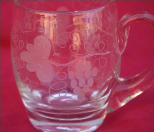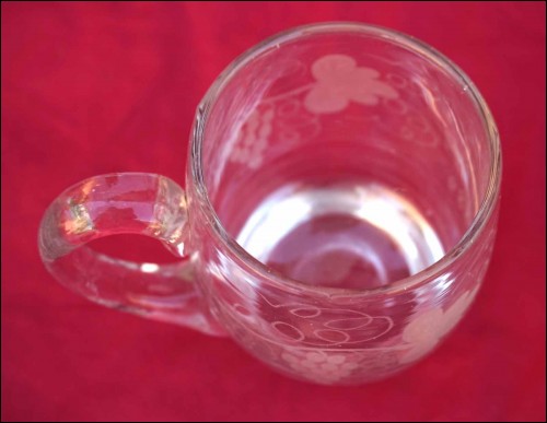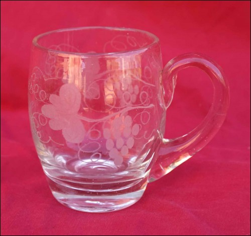 Antique french engraved glass with grapes and foliage to Marie Moro and dated 1889. 4 " (10.2cm) width with the handle, 2 3/4" (6.8cm) diameter, 3 1/2" (9cm) height. Perfect condition with pontil grinded as shown by the following pictures.