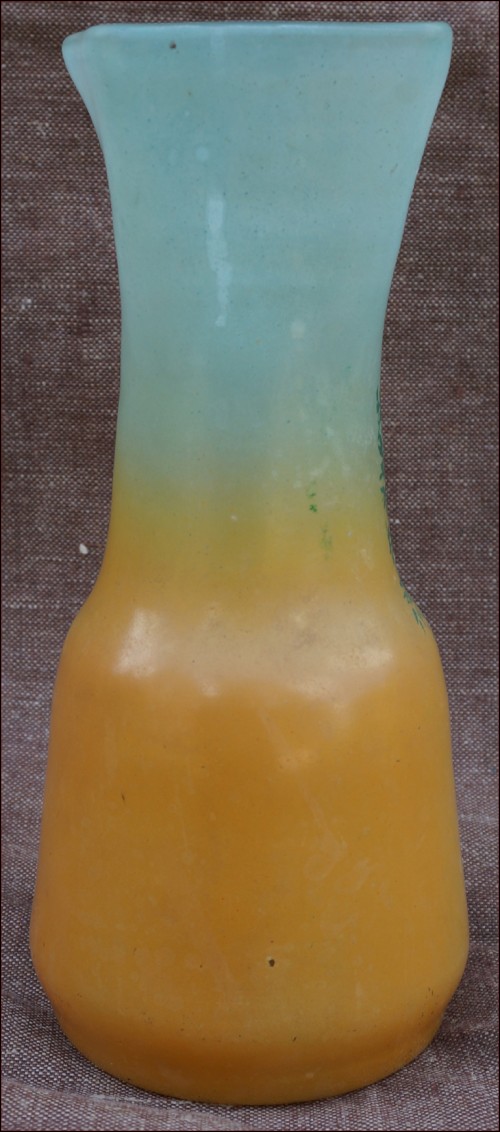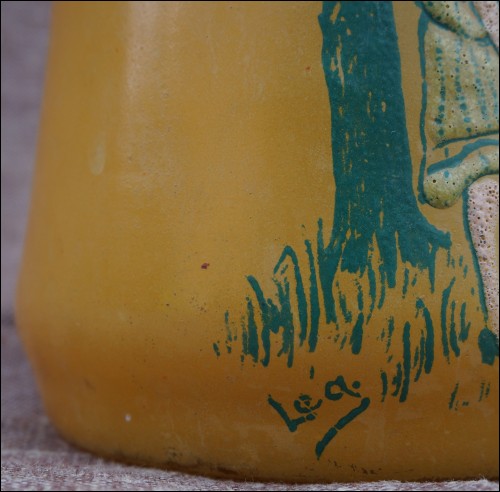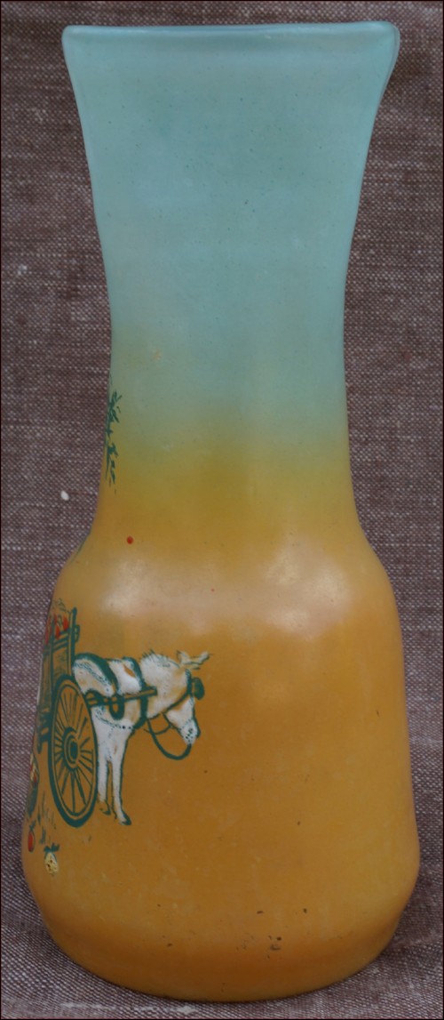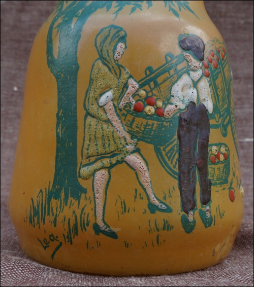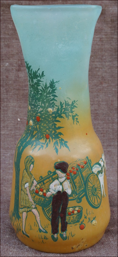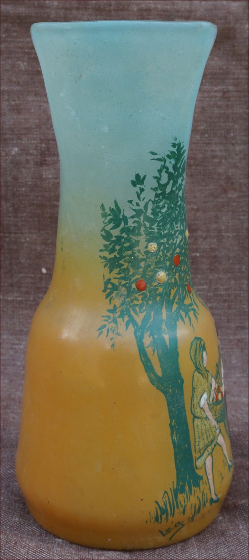Vase émaillé de la maison Legras à Saint Denis vers 1900. Il est peint à la main à décor de cueillette de pomme. Bel état, signé Leg. Hauteur 23,5 cm.