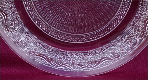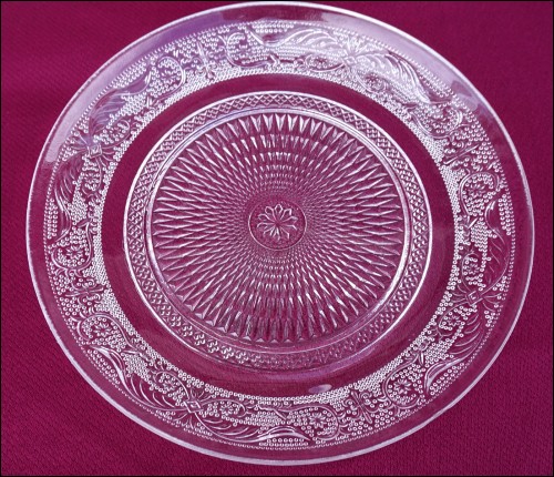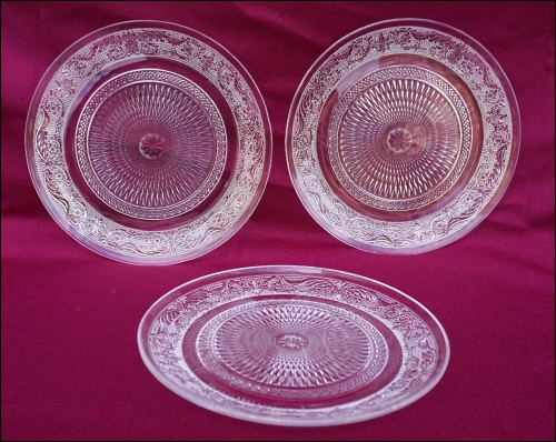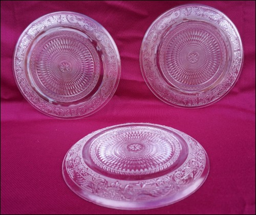 Set of 3 dinner plates in Sandwich pressed plate Trellis pattern made by Clear Crystal Clear Industries. 7 7/8" (20cm) diameter. Perfect condition as presented on the following pictures.